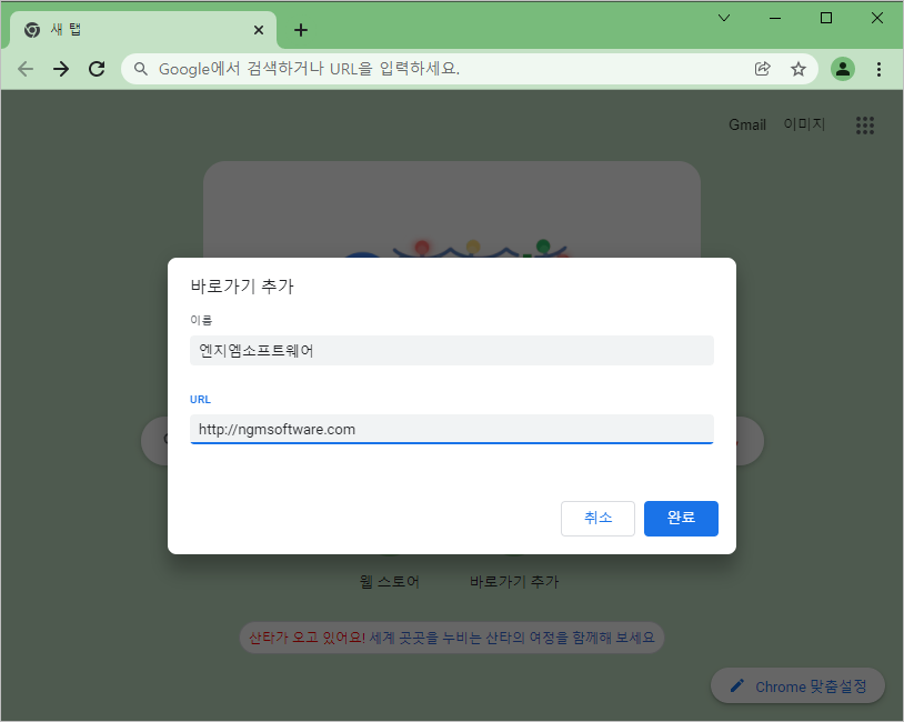 "바로가기 추가"를 클릭 해줍니다. 적절하게 정보를 입력하고, "완료"를 클릭하세요.