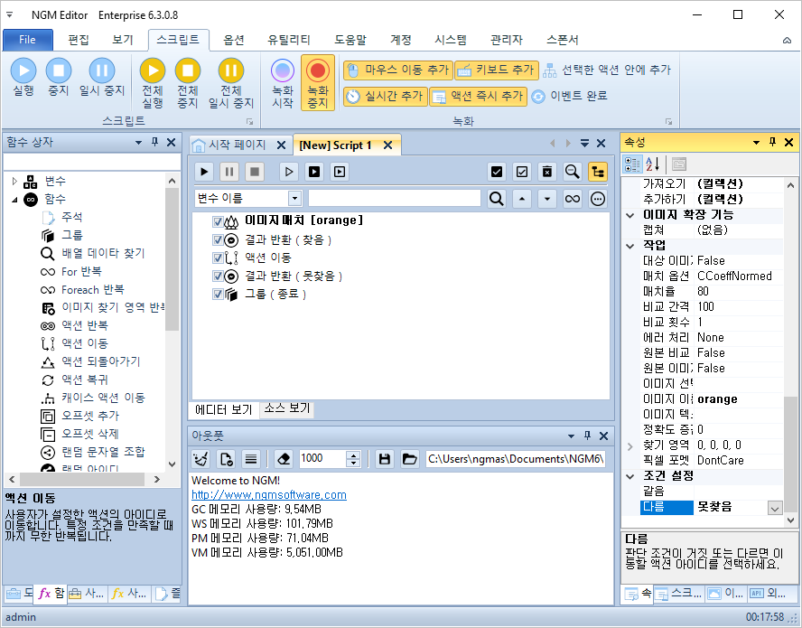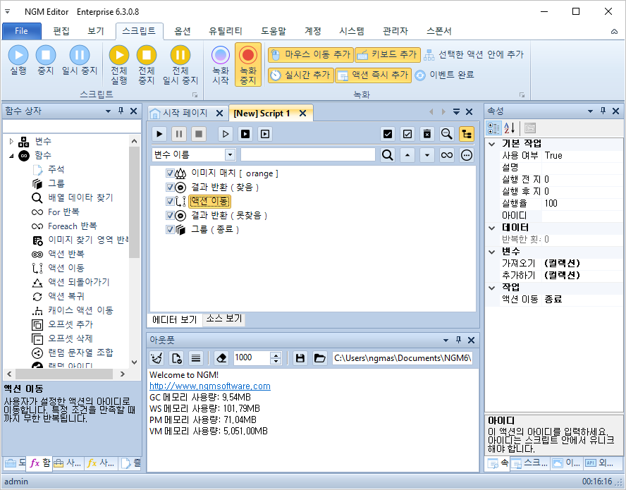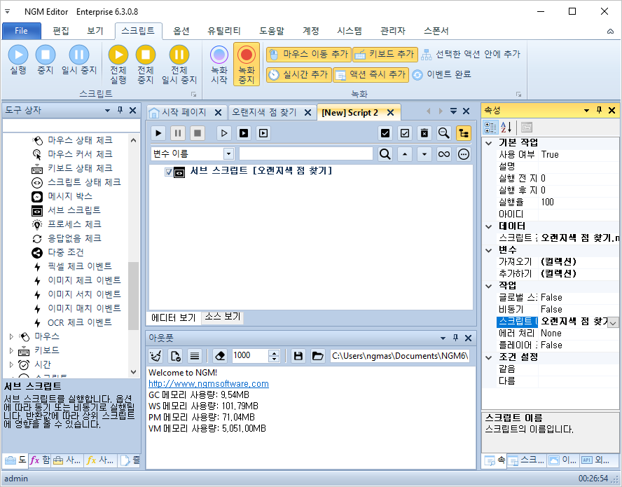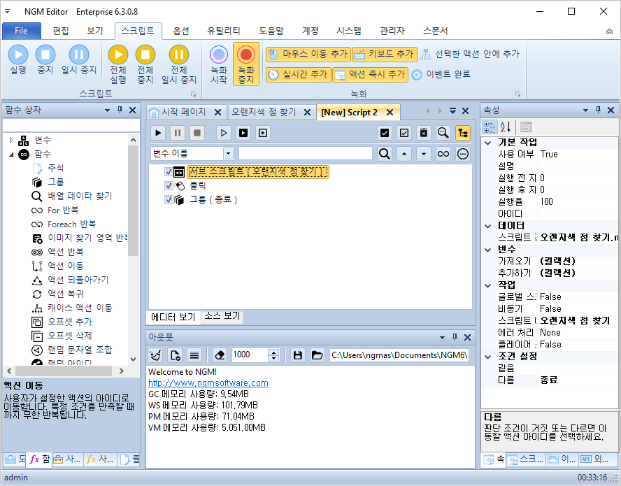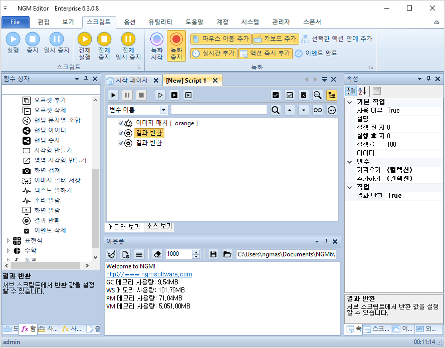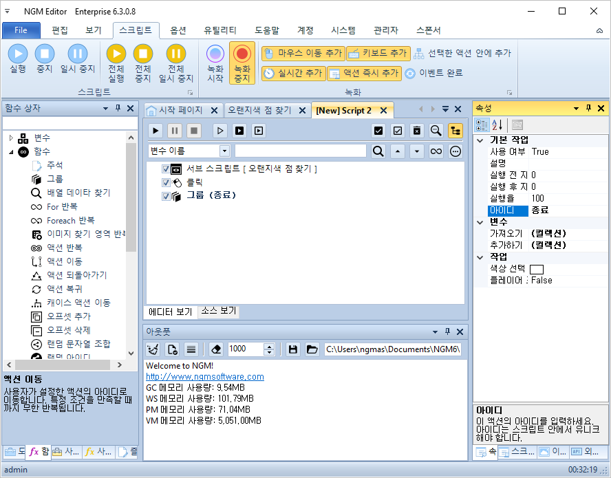 안녕하세요. 엔지엠소프트웨어입니다. 엔지엠 에디터에는 메소드 또는 함수와 같은 기능들이 몇가지 포함되어 있습니다. 일반적으로 [ 서브 스크립트 ]와 [ 스크립트 실행 ]이 있습니다. 이외에도 특정 주기 또는 특정 이벤트가 발생했을 때 서브 스크립트를 실행할 수 있습니다. 액션 이름은 스크립트지만, 매인 스크립트가 호출해서 재사용할 수 있는 함수와 같은 기능입니다. 아래와 같이 에디터를 실행하고, 새로운 스크립트를 하나 추가하세요.
