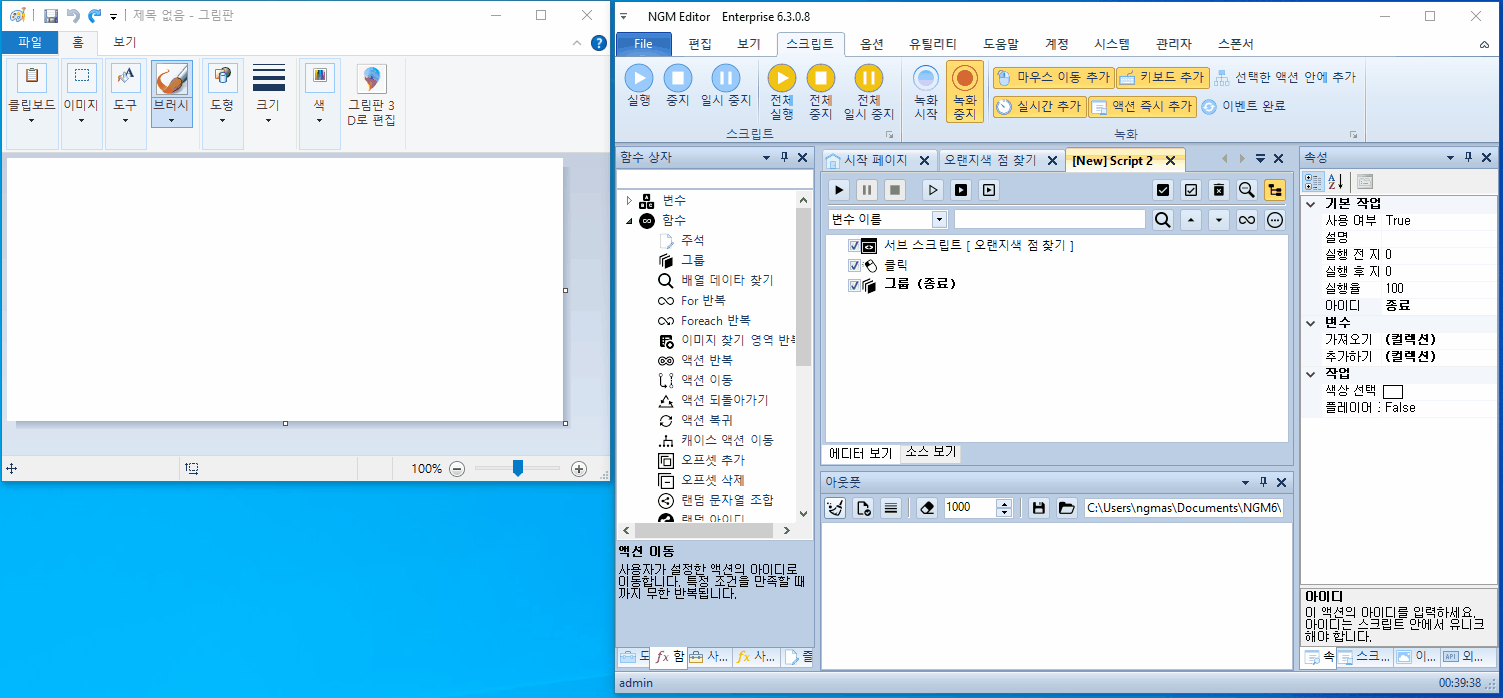 서브 스크립트에서 오랜지색 점을 찾으면 매인 스크립트가 어떻게 반응할지 결정해야 합니다. 여기에서는 오랜지색 이미지를 찾으면 그림판을 클릭하도록 하겠습니다. 물론, 오랜지색 점을 못 찾으면 클릭하지 않겠죠? 매인 스크립트도 아래와 같이 구성하세요.