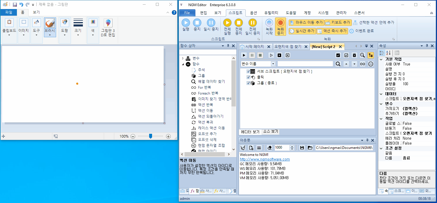 이 스크립트는 반환 값(True, False)이 있는 서브 스크립트입니다. 아래와 같이 그림판에 오랜지색 점을 추가하고, 판단하는 스크립트를 하나 만듭니다.