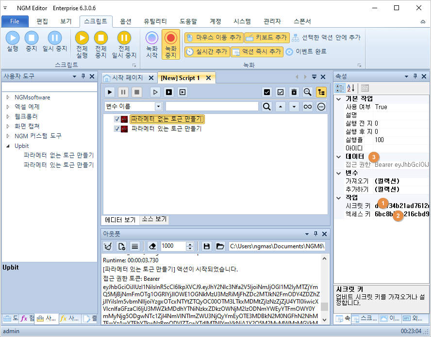 ①시크릿 키와 ②엑세스 키를 입력하고, 실행하면 ③접근 권한 토큰이 생성됩니다.