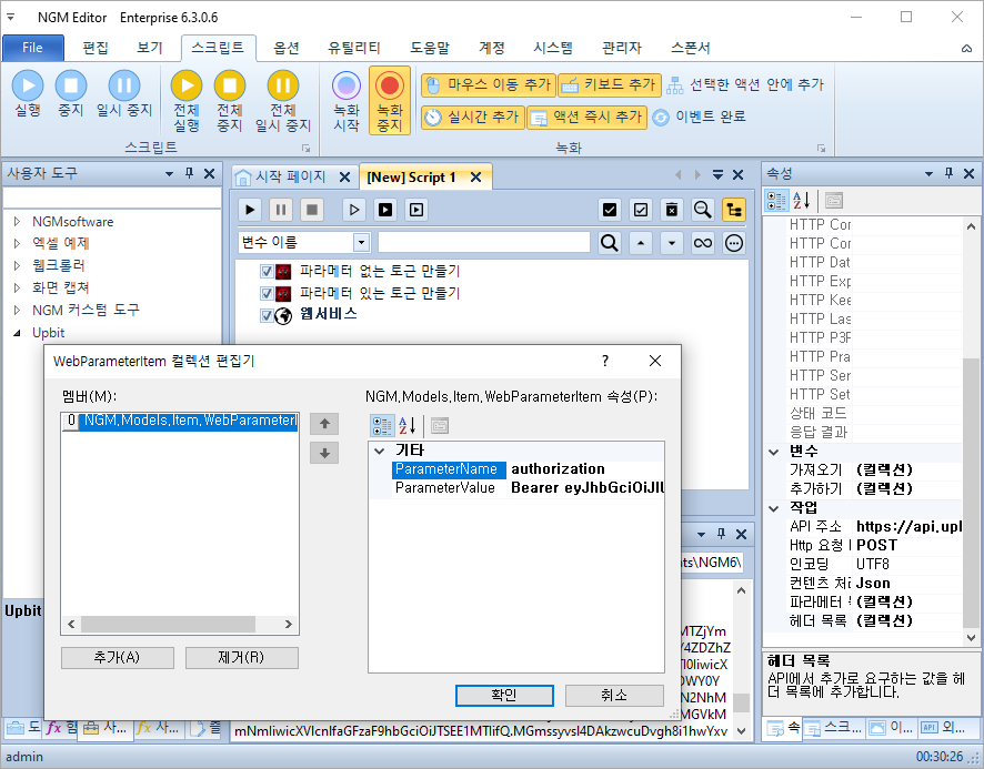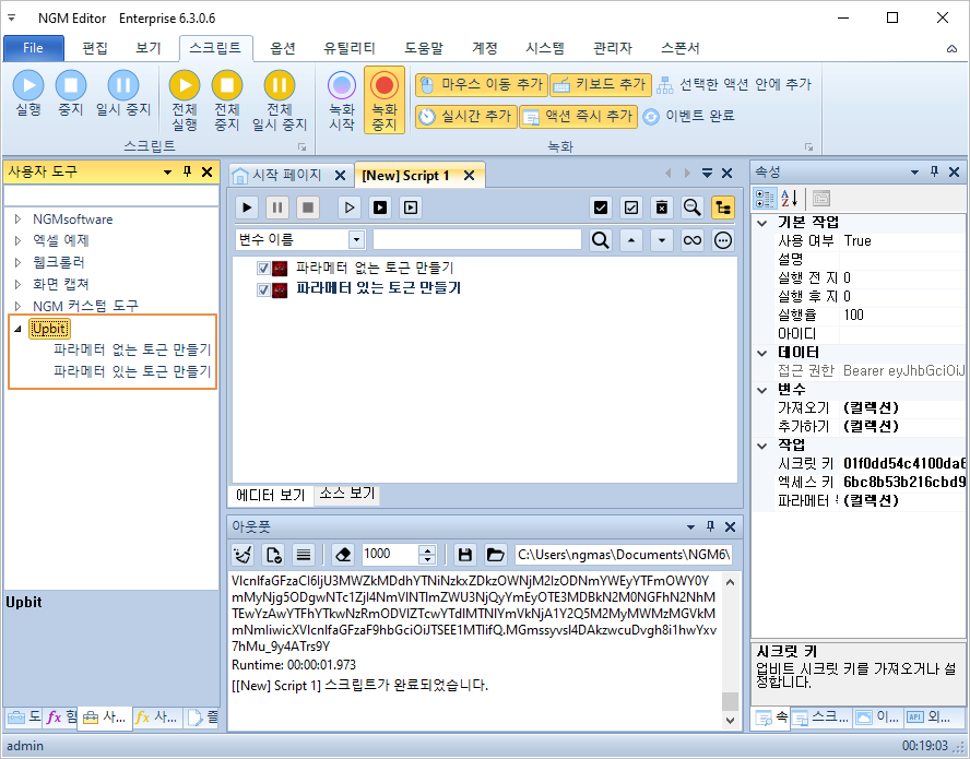 좌측 하단에 사용자 도구를 클릭하시면 업비트(Upbit) 카테고리가 생성된걸 확인할 수 있습니다. 업비트 카테고리에는 파라메터 없는 토큰 만들기와 파라메터 있는 토큰 만들기 액션 2개가 포함되어 있습니다. 업비트는 사용할 API에 파라메터 유무에 따라 다르게 접근 권한 토큰을 생성해야 합니다.
