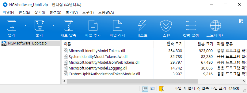 안녕하세요. 엔지엠소프트웨어입니다. 고객분의 요청에 의해 업비트 접근 권한 토큰(Authorization Token)을 만들어주는 커스텀 모듈을 만들었습니다. 이 내용을 학습하려면 업비트에 API 사용 승인을 받아야 합니다. 또한, 사용하려는 컴퓨터의 아이피를 등록하고, Access Key와 Secret Key를 메모 해두셔야 합니다. [ 여기 ]에서 업비트 API 토큰 생성 모듈을 다운로드 받은 후 압축을 풀어줍니다. 아래 그림과 같이 5개의 파일이 포함되어 있습니다.