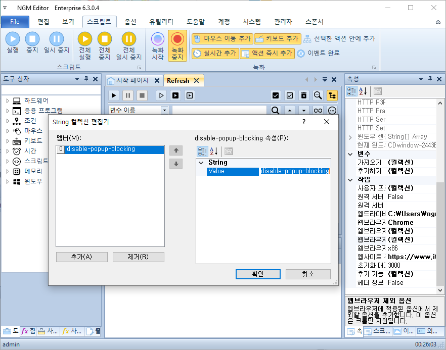 실행하면 팝업창이 표시되는걸 확인할 수 있습니다. 이번에는 아래와 같이 웹브라우저 제외 옵션에 아래 내용을 추가한 후 다시 실행 해보세요.