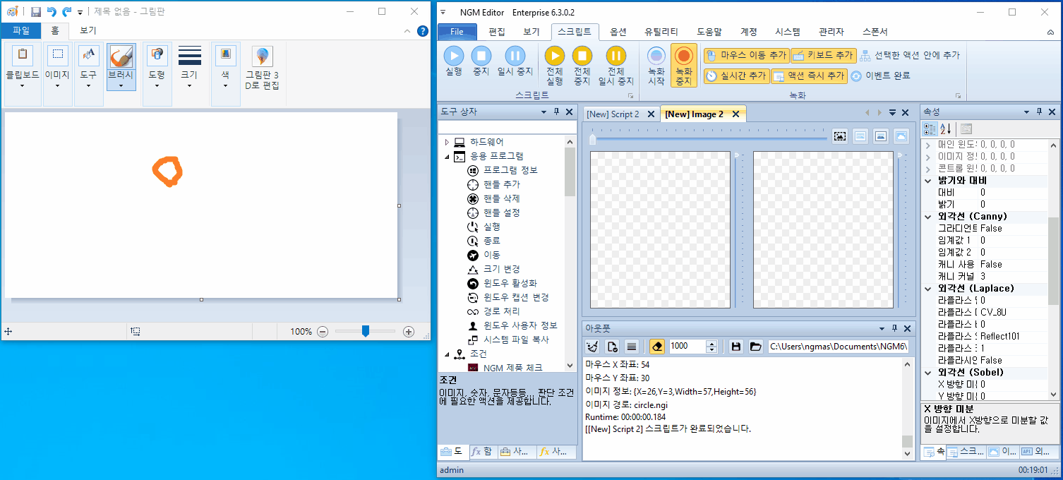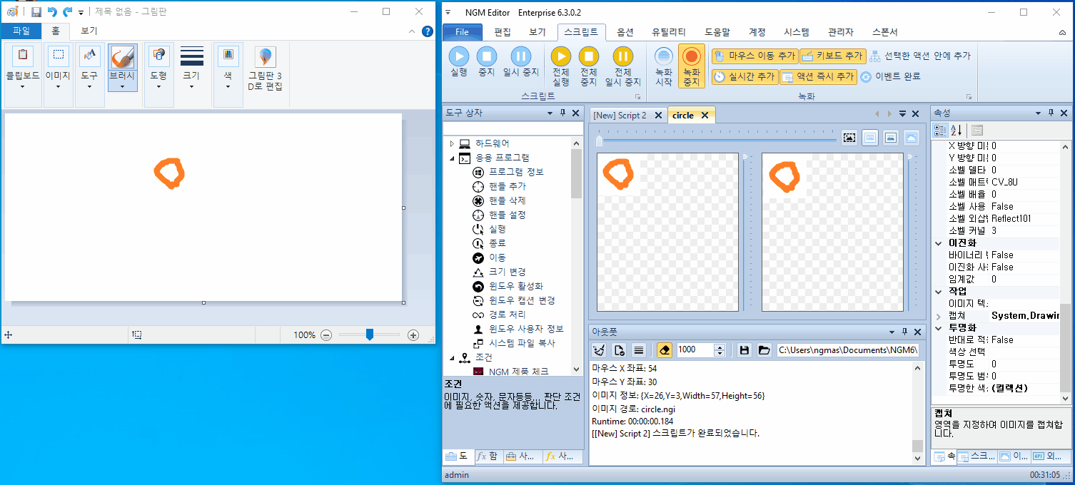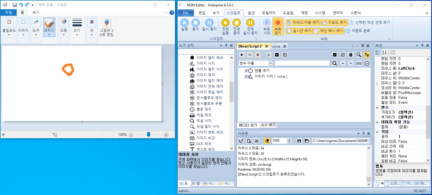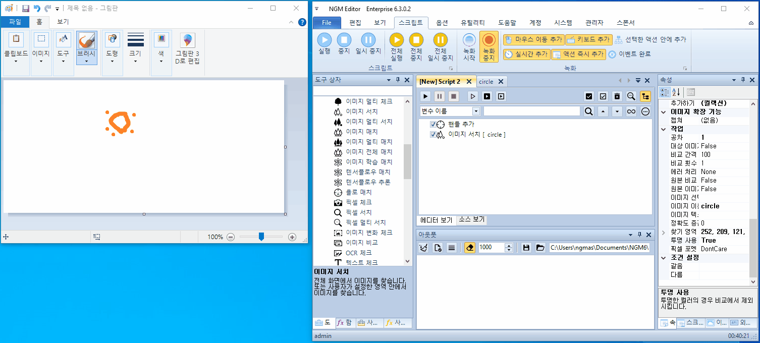[ 이미지 서치 ] 액션을 추가한 후 테스트를 해봅시다~ 이미지 서치에서 중요한 옵션은 투명 사용을 True로 해야 한다는 것입니다. 제외한 픽셀은 투명 정보를 가지게되고 이 정보들은 제외해야 하기 때문입니다. 투명을 사용한다는 것은 기존의 RGB 3개의 채널을 ARGB 4개 채널로 변환한다는 뜻입니다. 채널이 하나 더 추가되었기 때문에 속도는 느려지게 됩니다. 3개의 채널 값을 비교하다가 4개의 채널을 비교해야 하기 때문입니다.