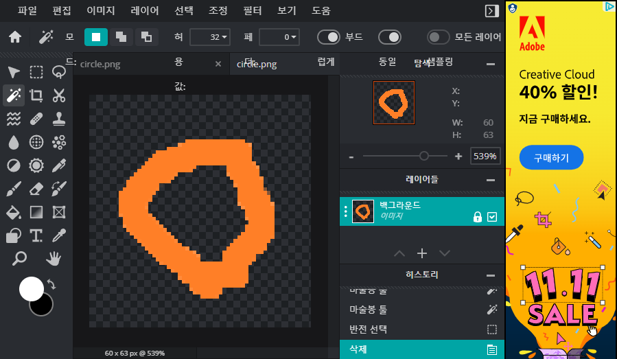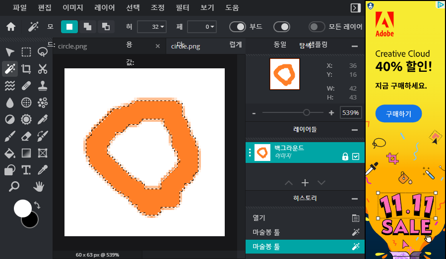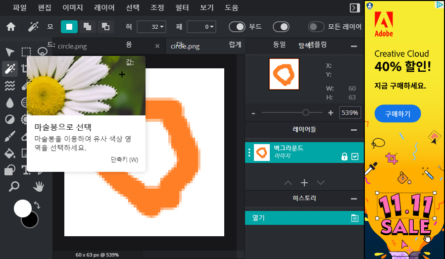 지우개 도구를 사용해서 직접 불필요한 부분을 지워도 되지만~ 여기에서는 흰색 배경이므로 마술봉 도구를 사용하겠습니다.