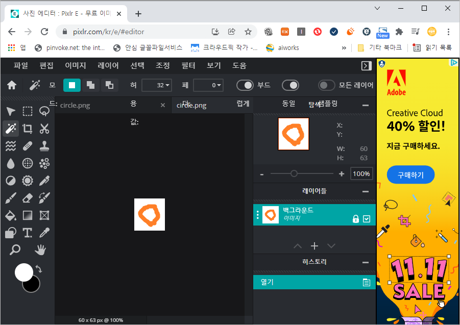 이미지를 쉽게 편집할 수 있는 포토샵이 있으면 좋겠지만~ 없으므로 픽슬러(Pixlr)를 사용하도록 하겠습니다. 보통 누끼딴다고 표현하는거 같더라구요^^; 아래 사이트에 접속한 후 바탕화면에 저장했던 이미지를 불러오세요. 픽슬러 사이트는 [ 여기 ]를 클릭하세요! 사용법은 포토샵과 비슷해서 사용하는데 크게 어려움은 없을거예요. 구글에 검색해보면 다양한 블로그가 나오니 참고하시면 됩니다.