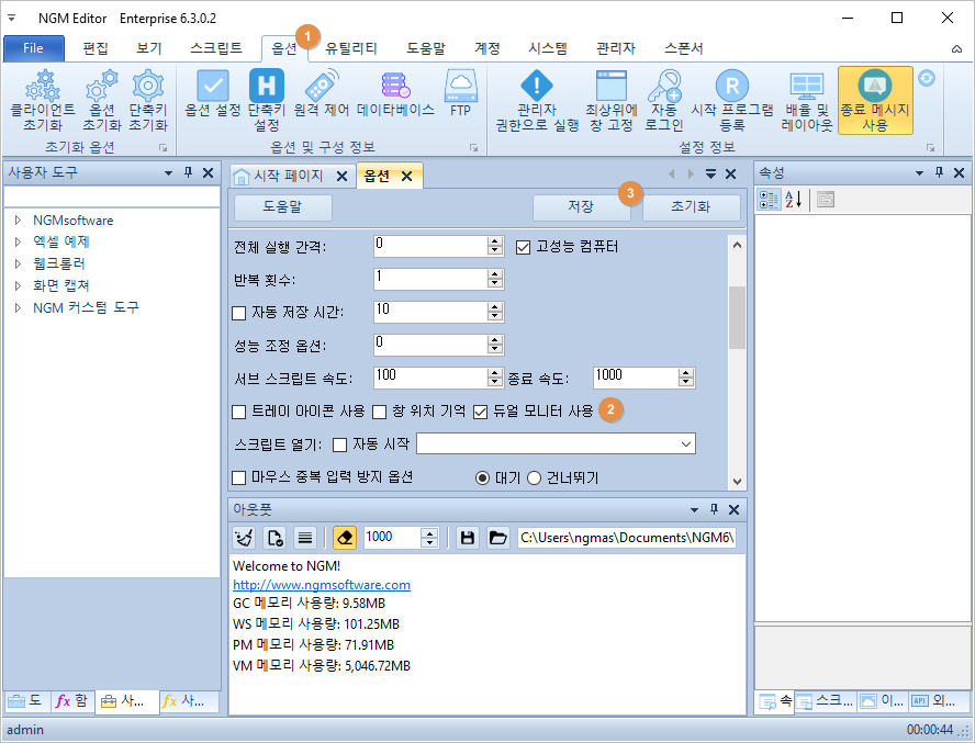 안녕하세요. 엔지엠소프트웨어입니다. 대부분은 매인 모니터에서 매크로 스크립트를 작성하실텐데요. 일부 특수한 환경에서는 매인 모니터와 서브 모니터 또는 3번째, 4번째 모니터를 사용해야 할수도 있습니다. 아래와 같이 에디터의 ①옵션 메뉴에서 ②듀얼 모니터 사용에 체크하고, ③저장하시면 컴퓨터에 연결된 모든 모니터에서 작업이 가능해집니다. 옵션 이름이 듀얼 모니터 사용이지만, 최대 모니터 4대까지 지원하고 있습니다. 하지만, 모니터가 많아진다는 것은 인식해야 할 화면이 크다는 의미이므로 성능에 많은 영향을 줍니다. 이런 부분들을 고려해서 작업하시면 좀 더 효과적인 매크로를 만들 수 있을겁니다^^