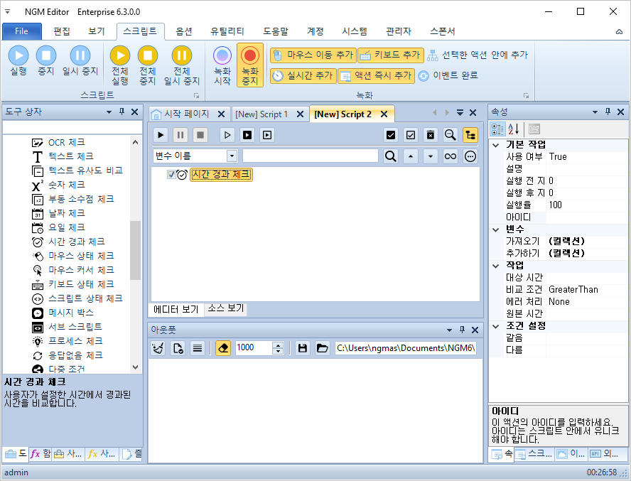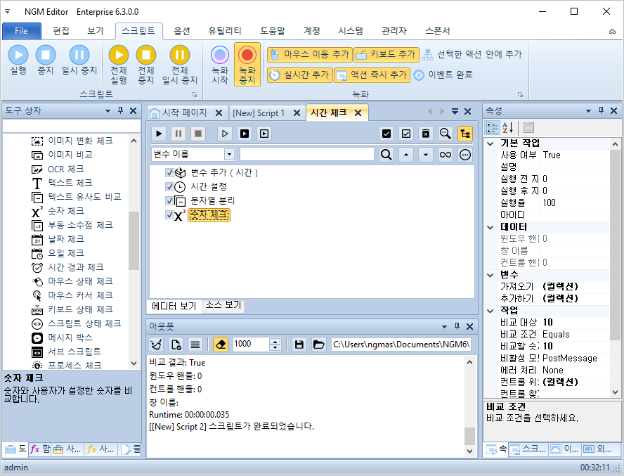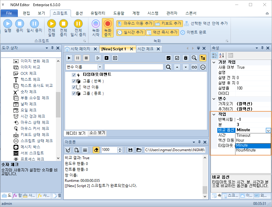 그래서 일반적으로 아래와 같이 스크립트를 구성하게 될겁니다. 첨부되어 있는 시간 체크.ngs를 참고하세요.