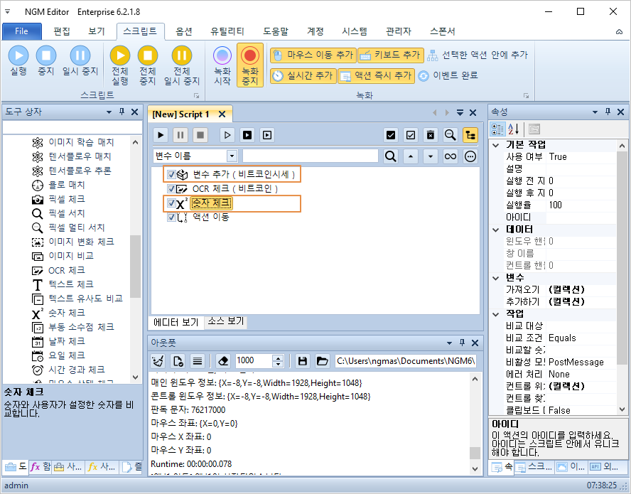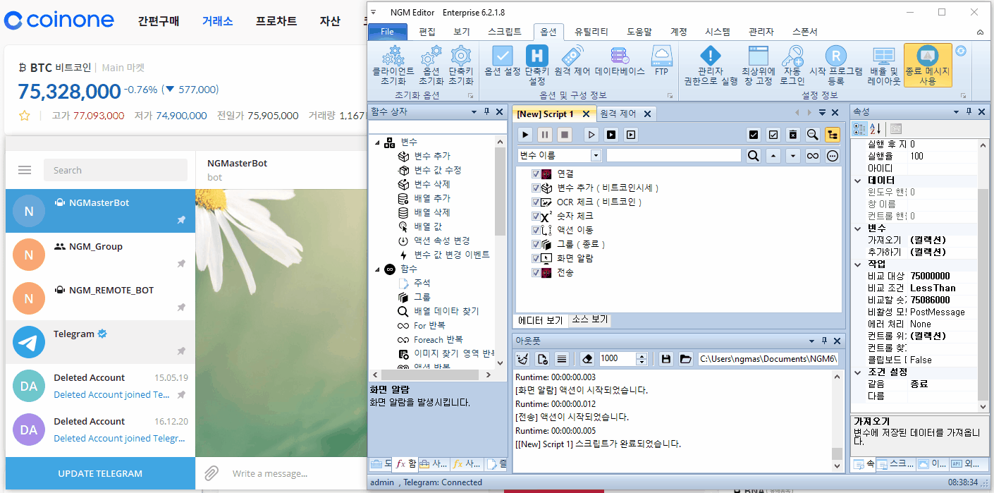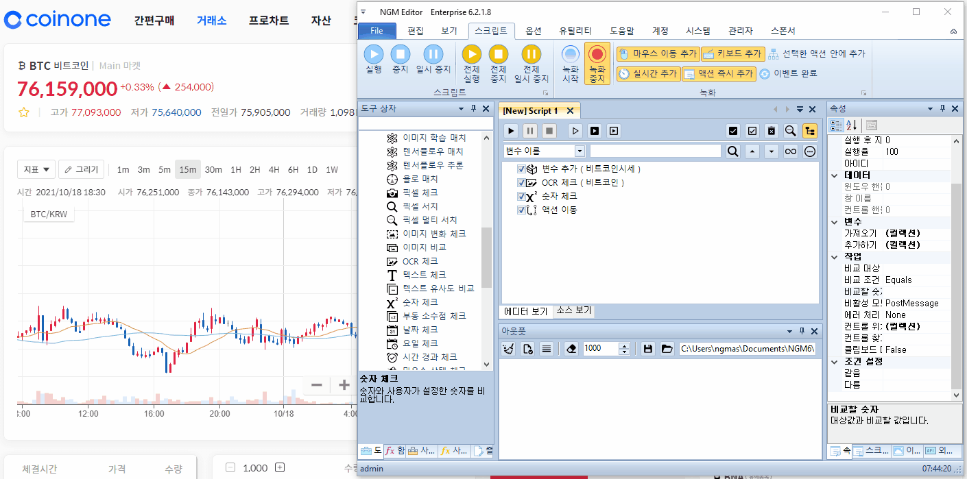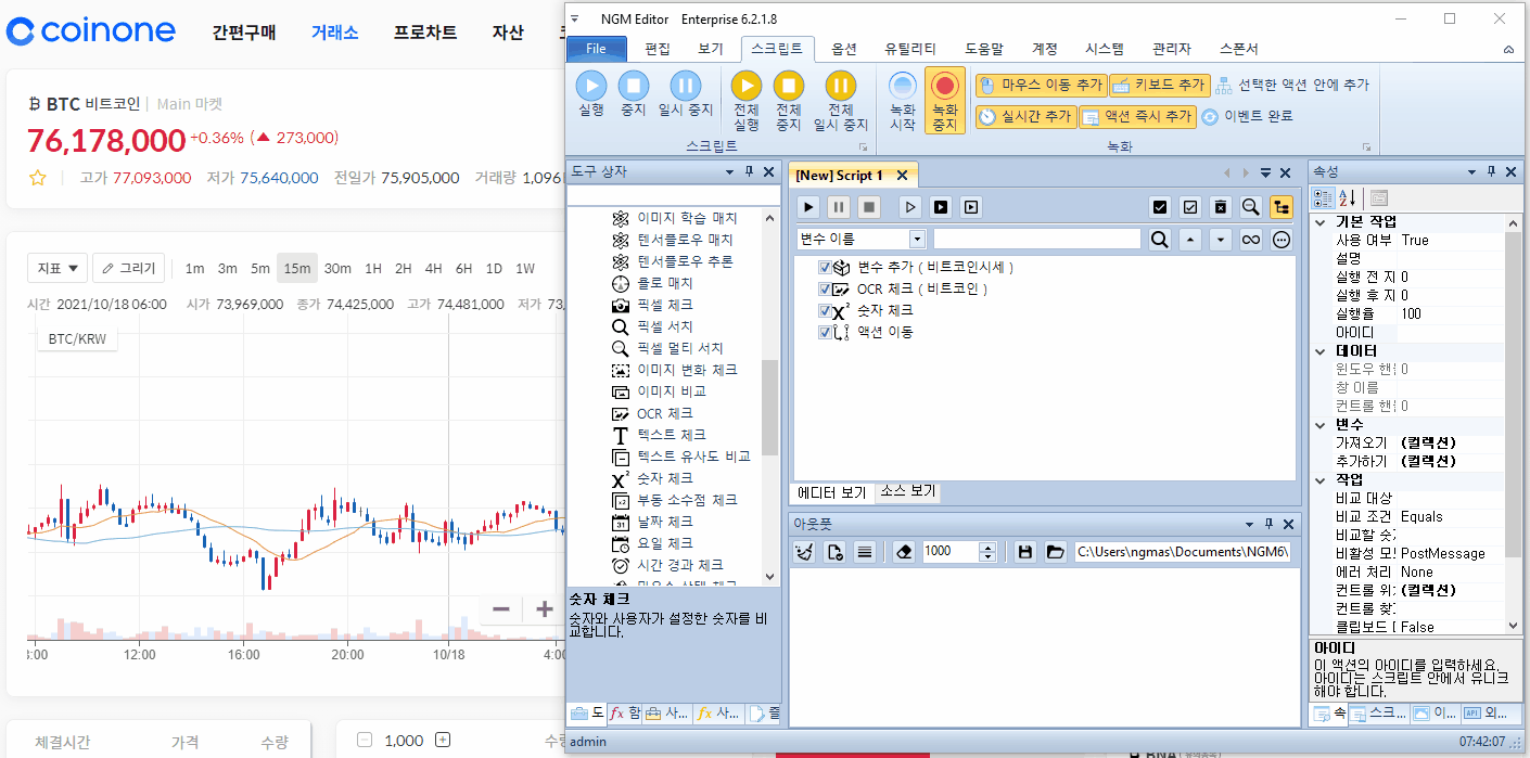 테스트를 위해 아래 동영상처럼 숫자 체크 액션의 속성을 변경하고 실행 해봤습니다. 현재 7천 5백만원에서 왔다갔다 하기 때문에 비교 대상 숫자를 7천 5백만원으로 설정했습니다. 7천 5백만원보다 시세가 높기 때문에 조건에 만족하고, 종료 그룹 액션으로 이동하면서 스크립트가 완료됩니다.