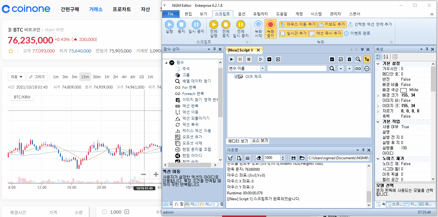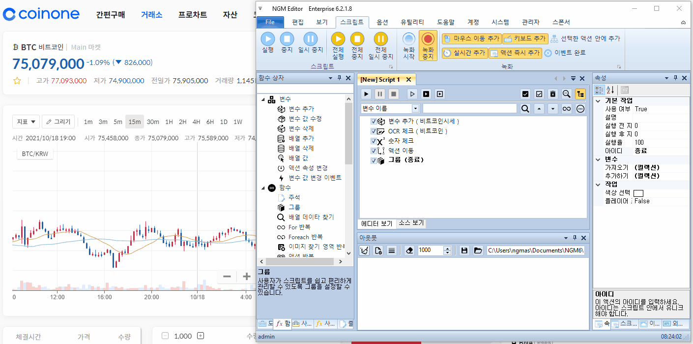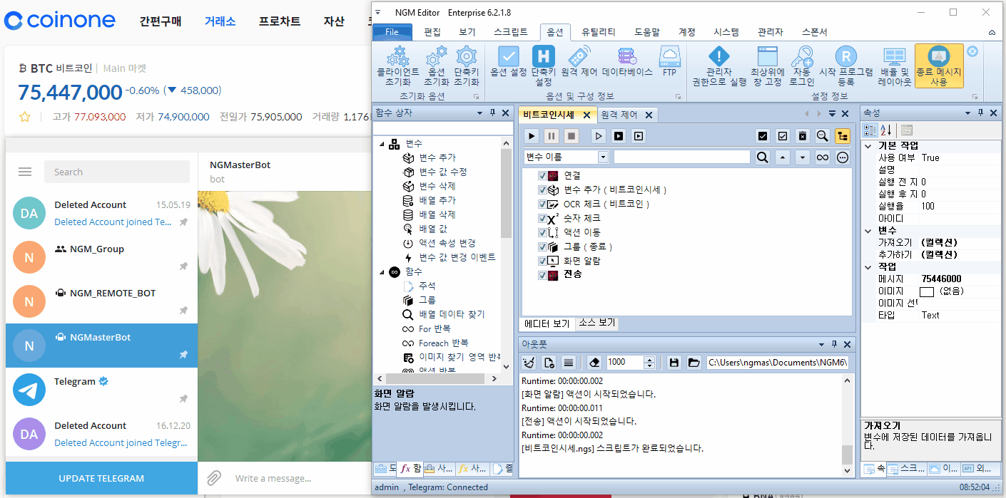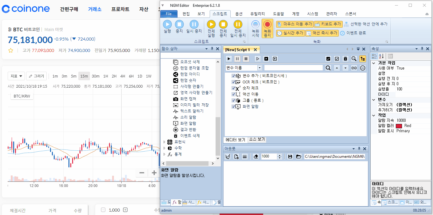 테스트를 위해 아래 동영상처럼 숫자 체크 액션의 속성을 변경하고 실행 해봤습니다. 현재 7천 5백만원에서 왔다갔다 하기 때문에 비교 대상 숫자를 7천 5백만원으로 설정했습니다. 7천 5백만원보다 시세가 높기 때문에 조건에 만족하고, 종료 그룹 액션으로 이동하면서 스크립트가 완료됩니다.