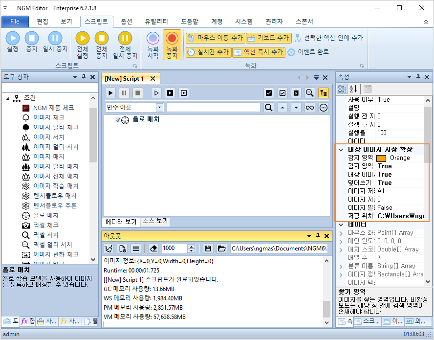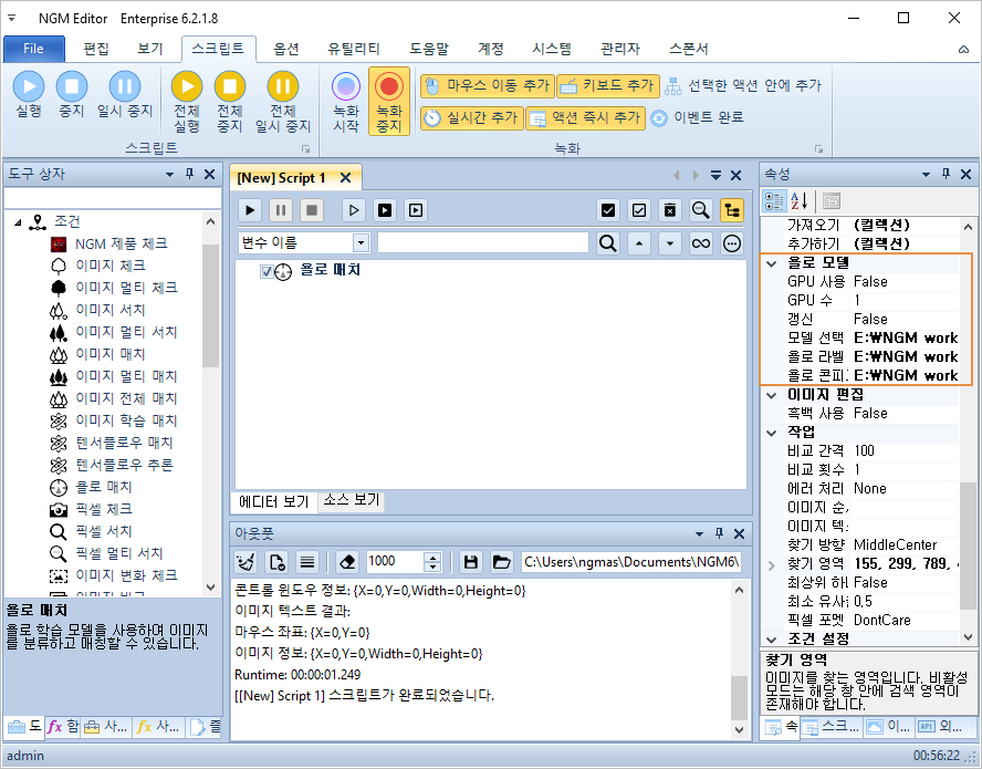안녕하세요. 엔지엠소프트웨어입니다. 성능을 테스트하기 위해 엔지엠 RPA 매크로를 실행하고, 다크넷에서 제공하는 데이타셋과 모델을 다운로드 받아줍니다. 자세한 내용은 [ 여기 ]에서 확인할 수 있습니다. 새로운 스크립트에 [ 욜로 매치 ] 액션을 추가하세요. 아래 그림을 참고해서 속성을 설정 해줍니다.