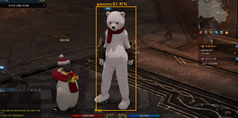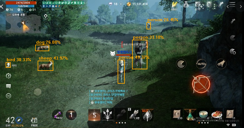 리니지2m에서 몬스터가 여우처럼 생겼는데 늑대로 인식하는군요. 그래도, 사람은 잘 찾아지는거 같습니다. 보통은 이미지를 캡쳐해서 직접 학습시켜야 하지만... 게임을 안하는 관계로 이미지를 구할 방법이 없습니다. 그래서, 다크넷에서 기본 제공하는 이미지로 테스트를 해본거구요. 딥러닝임에도 이미지 매치만큼의 성능을 보여줍니다. 플레이어로 실행하면 더 빠르게 처리할 수 있을겁니다.