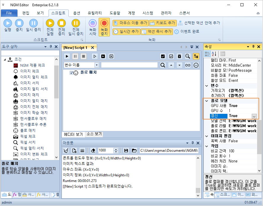 갱신 속성은 욜로 매치 액션에서 어떤 속성이 변경되면 메모리에 다시 로딩하기 위한 옵션입니다. 한번 실행한 후 다시 False로 변경하시면 됩니다. 위 그림과 같이 한번 실행한 후 갱신 속성만 False로 변경하고, 다시 한번 실행해야 정상적인 결과를 얻을 수 있습니다. GPU로하면 약 0.12초 정도 시간이 걸리는군요. 단순 계산으로는 CPU보다 약 10배가량 속도가 빨라진걸 알 수 있습니다. 사실 CPU 보다 정확도도 더 올라갑니다.