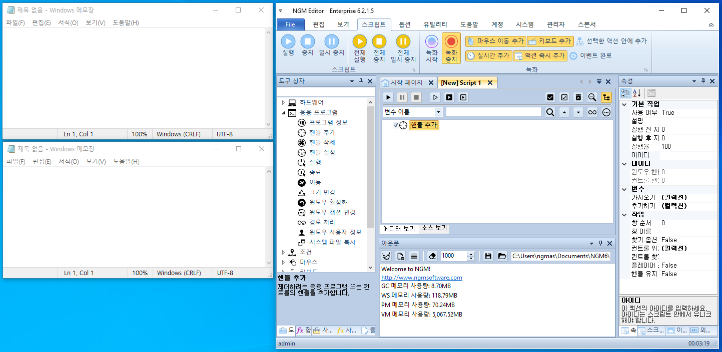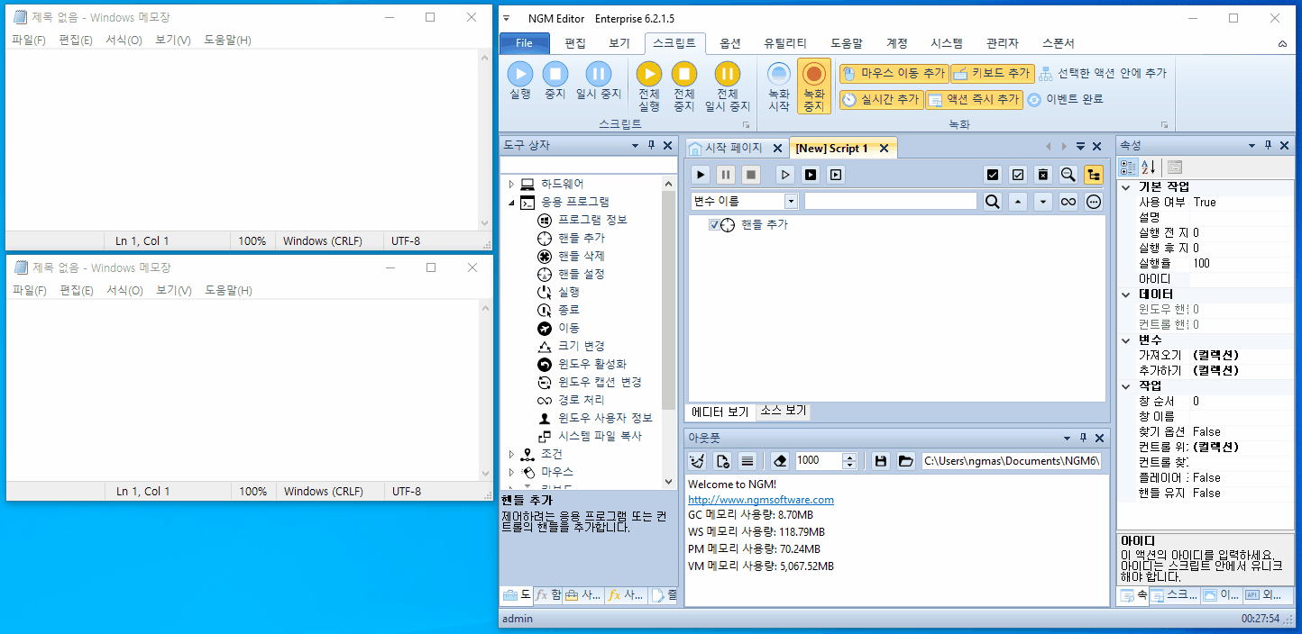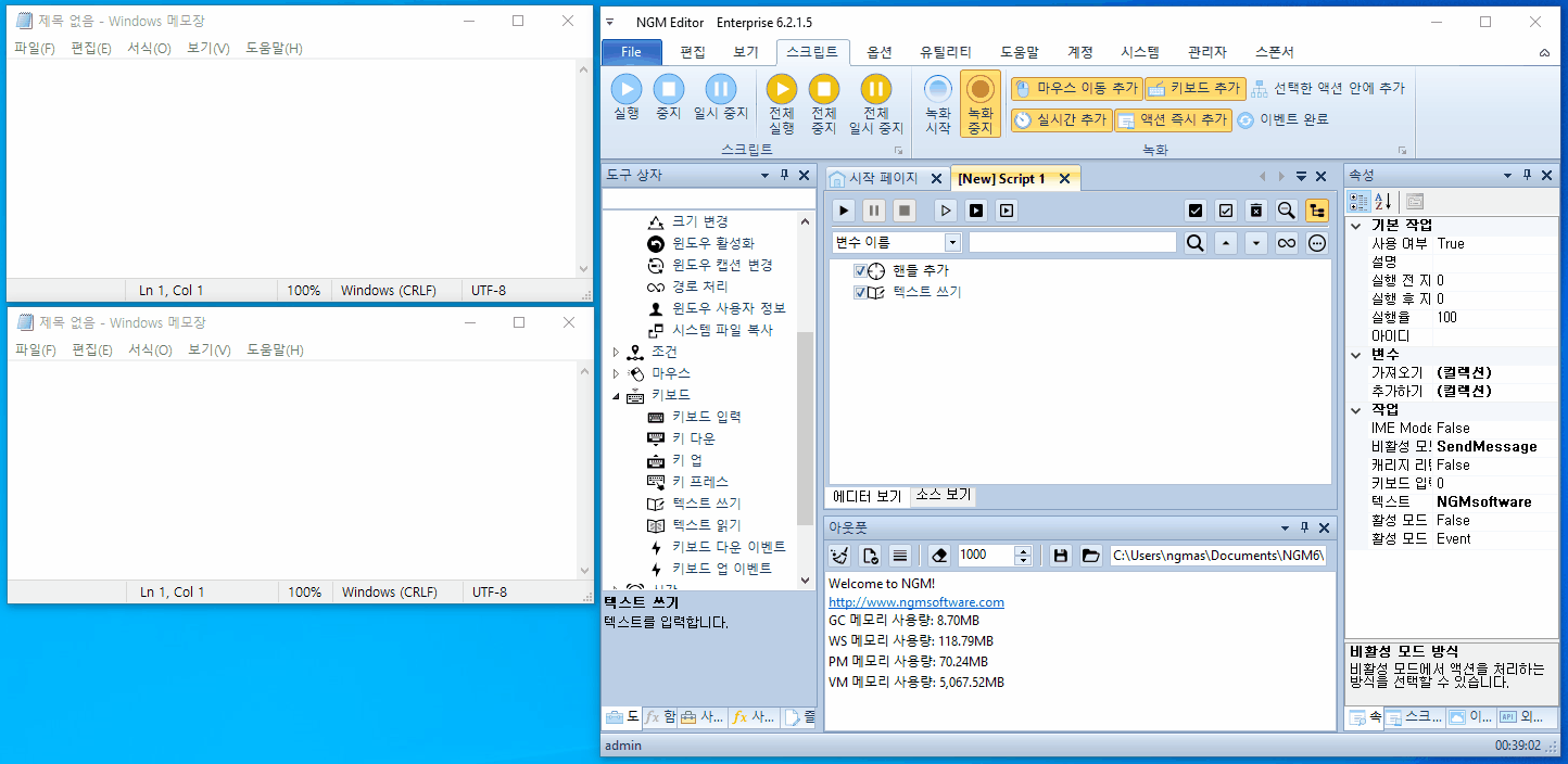 안녕하세요. 엔지엠소프트웨어입니다. [ 핸들 추가 ] 액션의 사용법은 대부분 잘 알고 계실겁니다. 대부분의 매크로 프로그램들이 활성 모드로 동작하는데요. 비활성 모드는 선택한 프로그램에 소프트웨어 신호를 직접 주입하는 방식을 말합니다. 그렇기에 다른 작업을하면서 매크로를 돌릴 수 있는 매우 강력한 기능중에 하나입니다. 엔지엠 매크로는 다이나믹하게 변경되는 핸들 값을 유지하기 위해 제어하는 컨트롤의 위치 정보와 프로그램의 이름으로 자동 계산해서 처리합니다. 그렇다보니 프로그램의 이름이 동일한 여러창을 제어할 수 있는 방법이 추가적으로 필요한데요. 당연히~ 이름이 같더라도 개별적으로 제어할 수 있는 기능이 기본 포함되어 있습니다. 이 테스트를 위해 아래 그림과 같이 메모장을 2개 실행하고 엔지엠 에디터를 실행하세요.