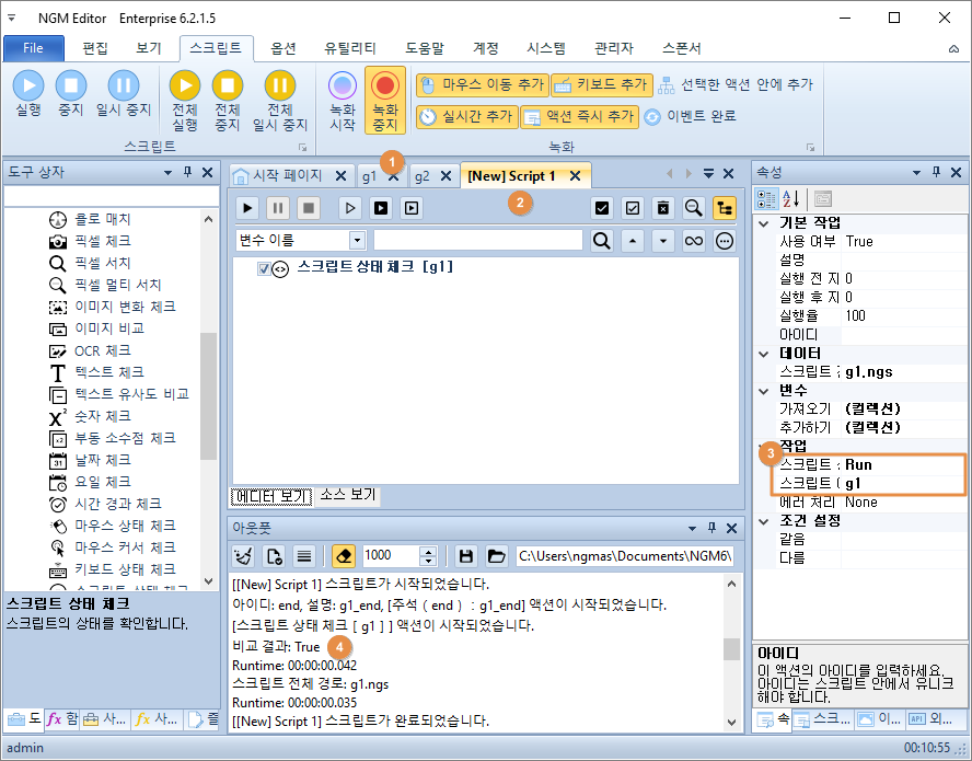 - 스크립트를 실행하고 결과를 보면 ①에서 실행한 g1의 상태가 Run이므로 비교 결과는 True를 반환합니다.