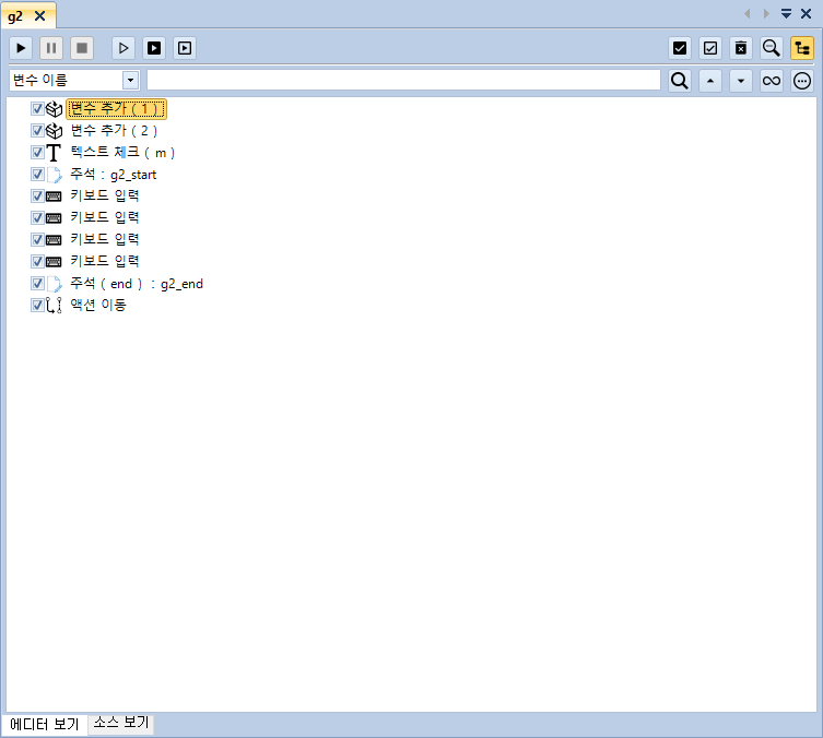 자~ 위의 내용들은 스크립트만으로 동작시킬 수 없습니다. 뭔가 부가적인 액션을 사용해야 하죠? 다른 시스템의 도움을 받지 않고, 독립적으로 동작하려면 상태를 체크할 루틴의 시작과 끝에 글로벌 변수에 상태를 업데이트 해줘야 합니다. 여기에서는 g1은 자신의 상태를 1 변수에 업데이트 하고 있습니다. g2에서는 1변수의 값을 가지고 조건 판단합니다. 반대로 g2는 2 변수에 자신의 상태를 업데이트하고, g1은 2변수 값으로 g2의 체크해야 할 루틴이 실행중인지 판단합니다.