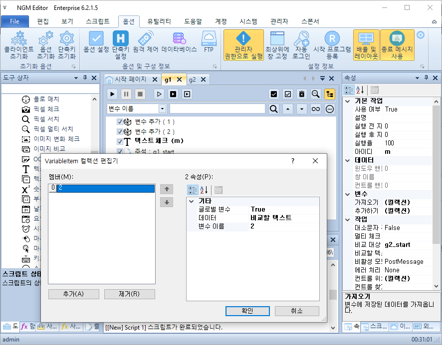 이런 루틴을 만드는건 여러가지 방법이 존재합니다. 엔지엠 에디터의 텍스트 쓰기 액션으로 값을 읽고 쓰면서 다른 스크립트의 상태를 체크하는겁니다. 여기에 힌트를 얻어서 엑셀로 작업하시는 분도 있을겁니다. 여러개의 아이디, 비밀번호가 있는 엑셀을 동시 다발적으로 로그인 체크한다면 엑셀이 더 유용할수도 있습니다. 로그인 후 작업이 완료된 캐릭터의 상태 정보를 엑셀에 기입하고, 중복해서 읽지 않도록 할수도 있으니까요. 마지막으로 데이타베이스를 이용하는 방법입니다. 엔지엠 에디터 또는 플레이어는 연결 속성을 저장해두면 실행과 동시에 데이타베이스에 연결해주고, 커넥션을 유지 해줍니다. 데이타베이스의 상태는 에디터와 플레이어의 하단에 표시해줍니다. 직관적으로 확인이 가능하죠~ 물론, 스크립트에서 연결 액션을 통해서 작업해도 됩니다. 같은 작업을 반복해야 하는 상황이라면 글로벌하게 처리해도 됩니다.