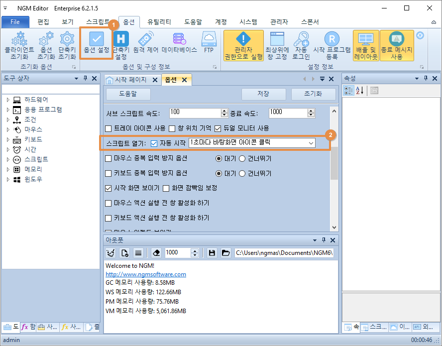 여기까지 설정해도 완전 무인 자동화가 되는건 아닙니다. 글로 설명하다보니 내용이 복잡해 보이고, 많은 부분을 설정해야 하는것처럼 보이는데요. 익숙해지면 1분도 안걸리는 설정 작업입니다. 아래 그림을 참고해서 옵션 메뉴의 ①옵션 설정을 클릭 해보세요. ②스크립트 열기에서 자동 실행할 스크립트를 선택 해줍니다. 그리고, 자동 시작에 체크하세요. 앞서 윈도우가 시작할 때 에디터 또는 플레이어를 자동 실행하게 했었습니다. 에디터가 실행되면 자동으로 스크립트가 열리고, 실행까지 동작 합니다.