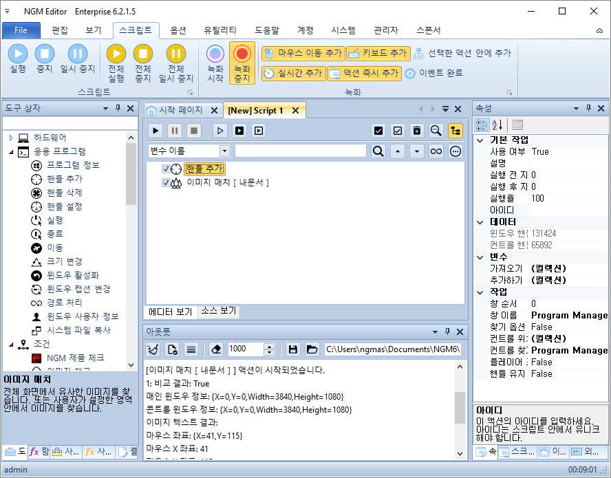 안녕하세요. 엔지엠소프트웨어입니다. 비활성으로 윈도우 바탕화면을 인식하는 방법은 생각보다 간단합니다. 어차피 윈도우 핸들을 이용하기 때문에 다른 비활성 매크로를 만드는것과 동일하거든요^^; 너무나도 당영한 내용이지만~ 다른 매크로 프로그램들은 비활성이 안되기도 하지만, 되더라도 바탕화면과 같은 일부 특수한 환경에서는 동작이 안됩니다. 간단하게 테스트를 하기 위해 엔지엠 에디터를 실행하고, 아래와 같이 스크립트를 구성 해보세요.
