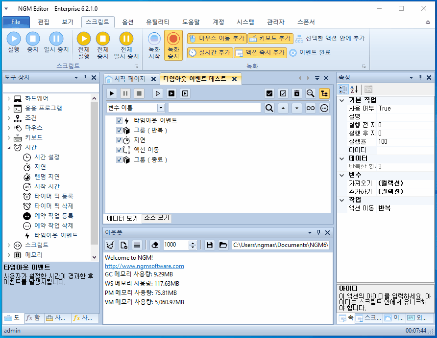 "예약 작업 이벤트"의 "액션 이동 아이디" 속성은 종료 그룹으로 선택 해줍니다. 사용자가 설정한 시간이 경과하면 이벤트가 발생되고, "종료" 아이디를 가진 마지막 그룹 액션으로 이동합니다. 그리고, 1초 지연 후 다시 반복으로 이동합니다. 이 액션은 직접 테스트 해보면 결과를 확인할 수 있습니다. 아래 동영상처럼 크론탭 속성에 "*/5 * * * * *" 스케줄러를 설정하고 실행 해보세요. 크론탭에 설정한 값의 의미는 매 분 5, 10, 15, 20, 25, 30, 35, 40, 45, 50, 55, 60초에 이벤트를 발생시킨다는 뜻입니다.