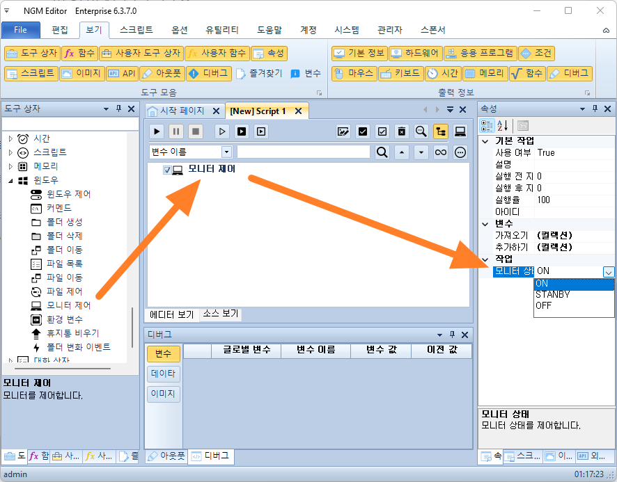안녕하세요. 엔지엠소프트웨어입니다. 엔지엠 에디터에는 시스템 시간 또는 서버 시간에 맞춰서 예약 작업을 실행해주는 기능이 포함되어 있습니다. 물론, 매크로의 기본이 되는 [ 마우스 클릭 ]이나 [ 키보드 입력 ]과 [ 이미지 서치 ], [ 화면 인식 ], [ 픽셀 ], [ 색깔 찾기 ]등등... 많은 기능을 제공하고 있습니다. 우선, 모니터 제어 액션을 사용하면 모니터를 끄거나 킬 수 있고, 대기 모드로 만들수도 있습니다.
