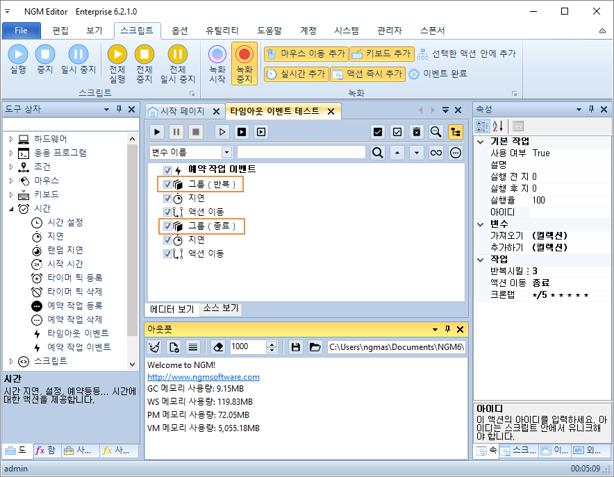 예약 작업 이벤트를 테스트하려면 다음과 같은 시나리오가 필요합니다. 사용자가 설정한 시간이 경과한 후 발생시킬 이벤트를 등록해줍니다. 그리고, 설정한 시간이 경과할 때까지 다른 로직을 수행하는 스크립트를 만듭니다. 여기에서는 [ 그룹 ]과 [ 액션 이동 ]으로 무한 반복하도록 했습니다. 사용자가 예약 작업 이벤트에 설정한 시간이 경과하면 이벤트 트리거가 동작하고, 이벤트에 설정한 아이디로 이동됩니다. 이 예제에서는 종료 그룹으로 이동하기 때문에 스크립트는 완료됩니다. 아래와 같이 스크립트를 구성하세요.