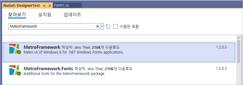 엔지엠 디자이너에서 "강력한 이름의 어셈블리가 필요합니다." 에러가 발생하는 경우 아래 그림과 같이 "MetroFramework"를 프로젝트에 설치해야 합니다.