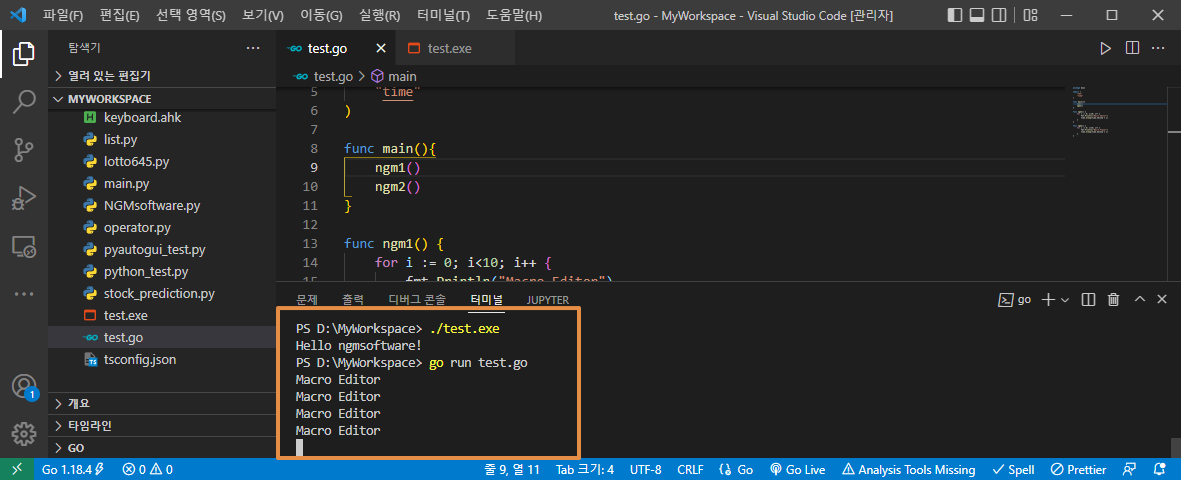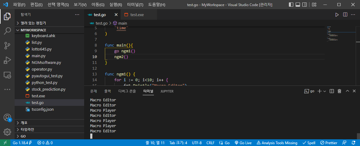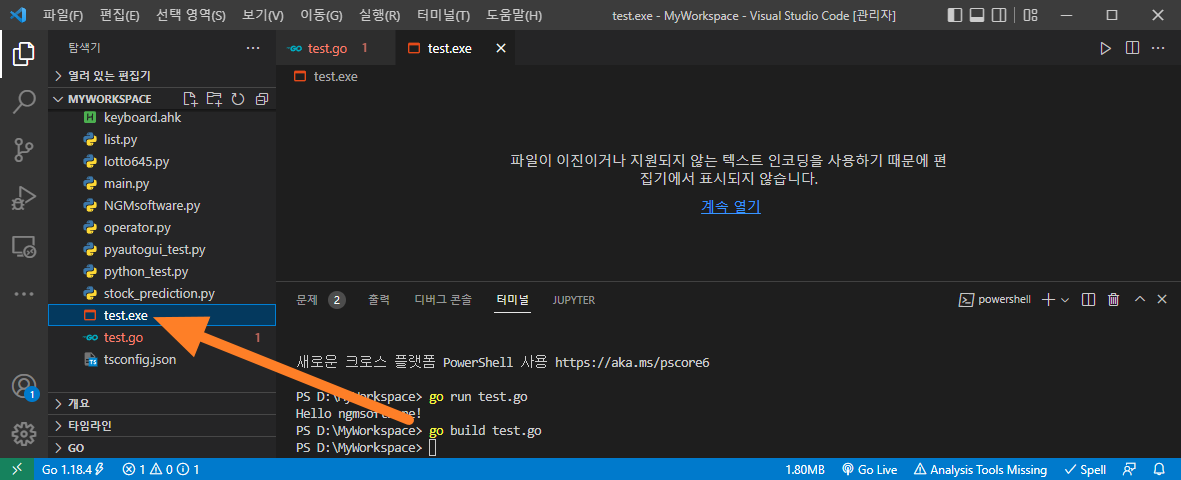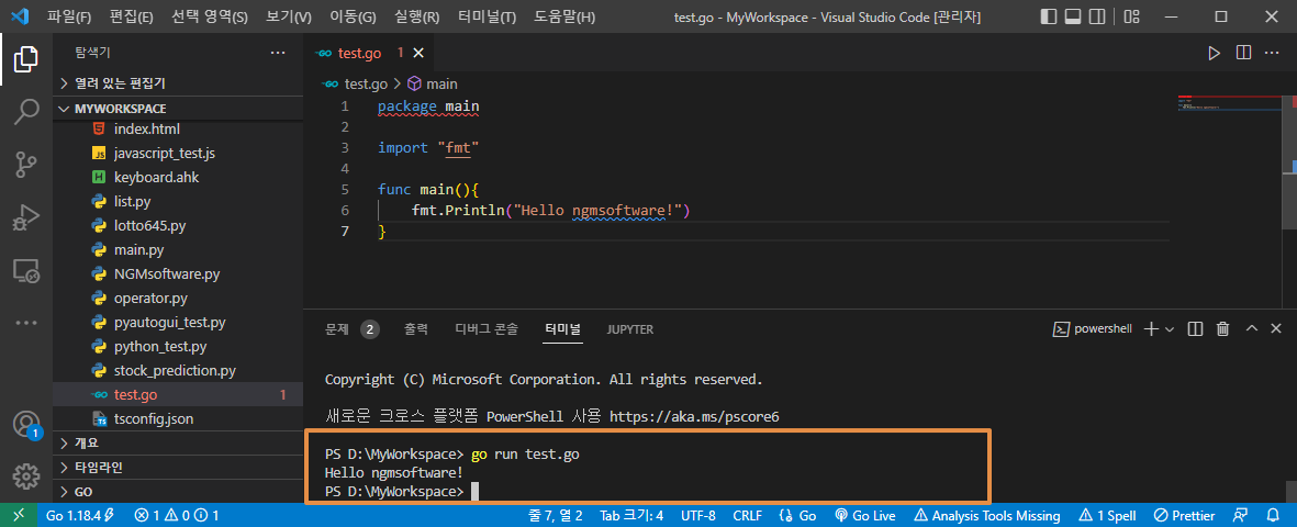 으악! 2시간이나 작성했던 글이 날라가다니... ㅠㅠ; 이 아래 내용은 처음 작성했던 글에서 많은 부분이 변경되고, 축소 되었습니다. 이점 감안하고 봐주세요^^; 아래 그림과 같이 워크 스페이스에 test.go 파일을 만들었습니다. 그러면, 자동으로 Visual Studio Code에서 적절한 패키지를 찾아서 추천 해줍니다. 망설이지 말고~ 무조건 설치하세요!