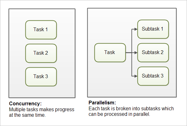 go 키워드를 제거하고 비교 해보시면 차이점을 명확하게 알 수 있을겁니다. go 언어를 학습할 때 go로 검색하면 자료가 나오질 않아서 학습하는데 문제가 됩니다. 그래서, 고 언어를 고랭(golang)이라고 부릅니다. 이렇게하면 검색이 잘 되거든요. 그리고, 글의 처음에 등장하는 고퍼(gopher)는 고랭을 사용하는 유저를 말합니다. 이런 커뮤니티들을 잘 활용하면 프로젝트를 진행하는데 있어서 많은 도움을 받을 수 있을겁니다. 아~ 그리고, 컨커런시와 혼동이 오는 개념이 하나 있는데요. 패러럴리즘입니다. 이 둘의 차이점은 아래 그림을 보면 쉽게 이해할 수 있을겁니다.