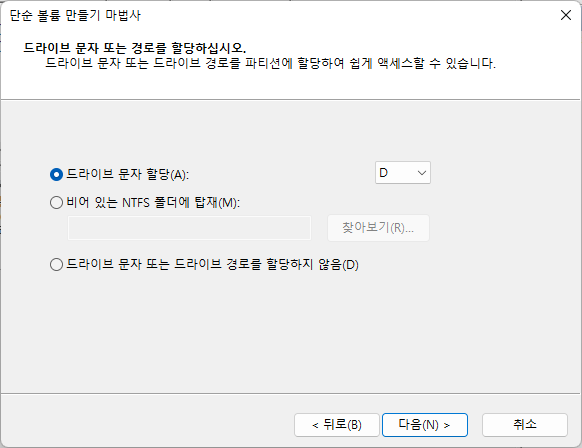 드라이브 문자는 D로 설정한 후 다음을 클릭했습니다.