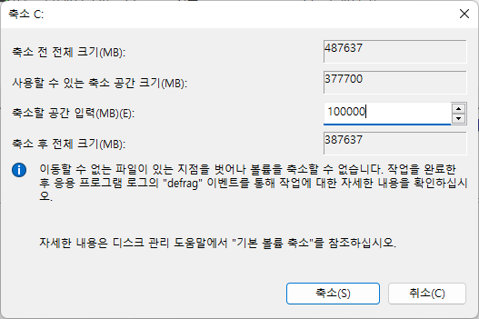 볼륨 축소를 선택하면 축소할 수 있는 최대 공간을 자동으로 계산해줍니다. 축소할 공간을 100기가바이트로 입력하고 축소 버튼을 클릭합니다. 축소할 공간은 사용자의 상황에 따라 다를 수 있습니다. 제 경우에는 D드라이브에 100기가 정도면 충분할거라 생각해서 입력한 값입니다. 여러분들은 C드라이브 용량을 생각해서 적절하게 입력하시기 바랍니다.
