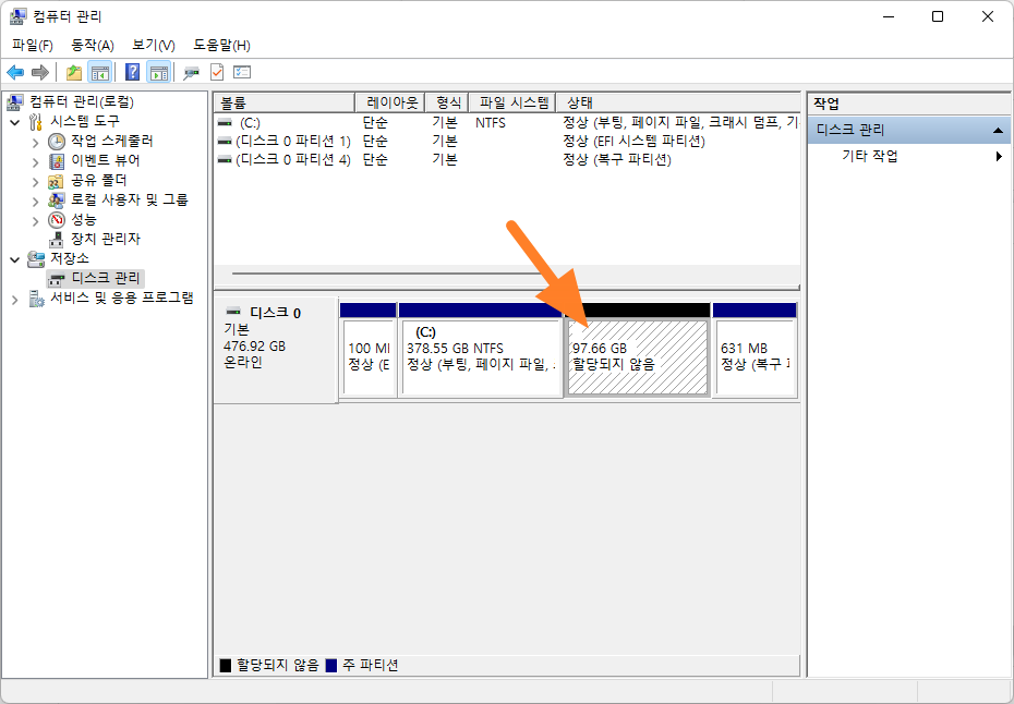 컴퓨터 관리에서 디스크 관리를 선택합니다.