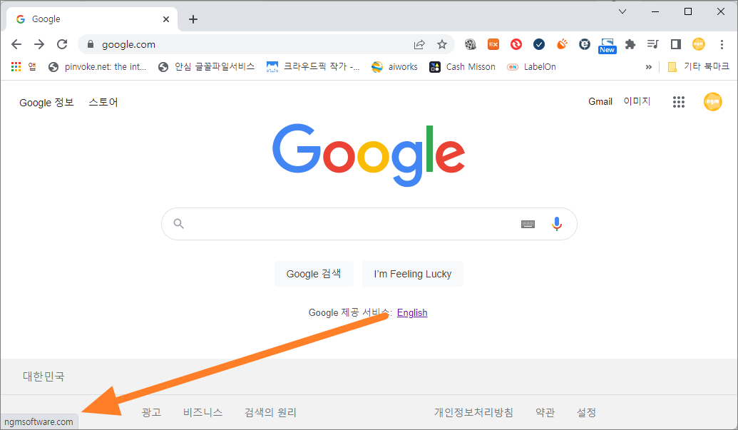 구글 홈페이지로 이동한 후 아래와 같이 링크에 마우스를 살~ 올려보세요. 엔지엠소프트웨어 주소로 변경된걸 알 수 있습니다.