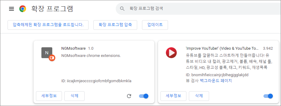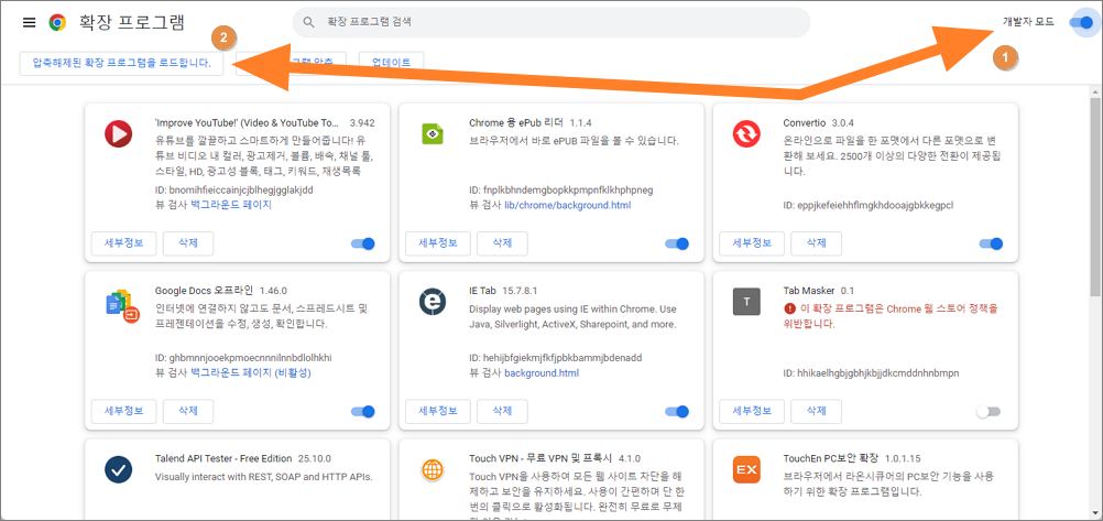 코드 내용은 간단합니다. 페이지 문서에서 a 태그를 모두 찾아옵니다. 그리고, 반복기(forEach)로 a 태그의 href 속성 값을 엔지엠소프트웨어 주소로 변경해줍니다. 끝입니다. 간단하죠? 뭔가 서비스할만한 내용이 아니라서 코딩이 많지는 않습니다. 이제 크롬 브라우저에서 chrome://extensions를 입력해보세요. 아래 그림을 참고하셔서 ①개발자 모드를 켜고, ②압축해제된 확장 프로그램을 로드합니다. 를 클릭하세요.