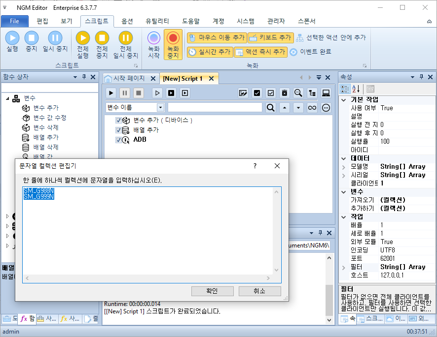 안녕하세요. 엔지엠소프트웨어입니다. 엔지엠 매크로는 반복적인 업무를 자동화할 수 있는 RPA 솔루션입니다. 오늘은 안드로이드 핸드폰 또는 스마트폰을 USB로 컴퓨터에 연결하거나 녹스 앱플레이어, 엘디 앱플레이어에서 하나씩 개별 조작할 수 있는 필터를 어떻게 변수로 처리하는지에 대해 알아보도록 하겠습니다. 참고로, 안드로이드 앱플레이어나 미러링 프로그램은 ADB를 사용합니다. ADB는 연결된 모든 기기(Device)에 신호를 줍니다. 그래서, 하나씩 개별적으로 매크로를 동작시키려면 필터를 사용해야 합니다. 아래와 같이 엔지엠 에디터를 실행하고, 새로운 스크립트를 추가하세요.