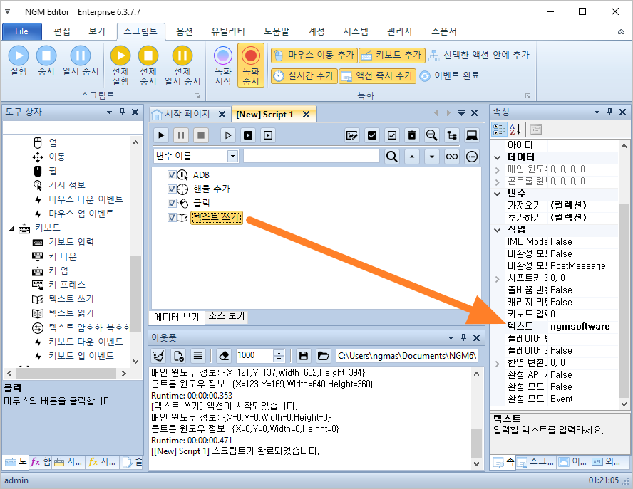키보드 동작도 마우스와 동일합니다. ADB가 우선이기 때문에, 비활성 핸들은 동작하지 않습니다. 테스트를 위해 아래와 같이 [ 텍스트 쓰기 ] 액션을 추가하고, 텍스트에 "ngmsoftware"를 입력하세요.