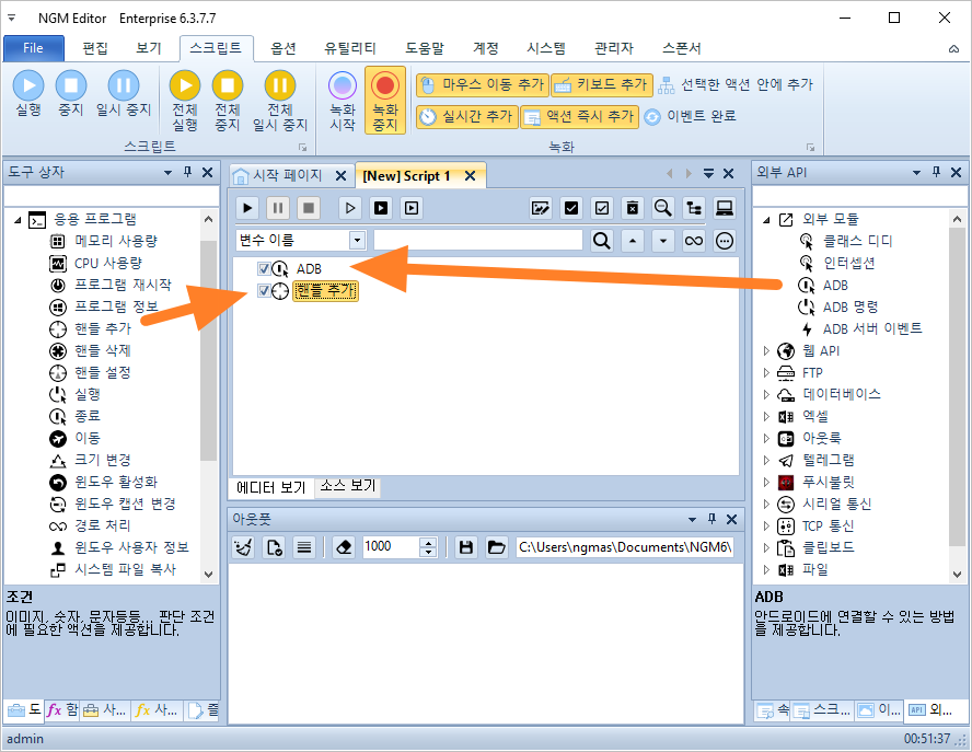 [ ADB ] 연결 액션과 [ 핸들 추가 ] 액션을 스크립트에 추가하세요.