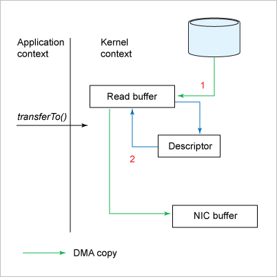 이 동작은 버퍼를 할당 받고, 디스크에서 파일을 버퍼로 읽어들여서 다시 소켓으로 전송하는 아주 간단한 방법입니다. 1024byte 이상의 데이타를 처리하기 위해 while문을 사용합니다. 아무튼, 프로그램에서 버퍼를 만들고, 운영체제가 데이타를 읽는 버퍼를 다시 만듭니다. 그리고, 소켓 버퍼로 보내고 실제 네트워크로 전송하기 위한 장비 버퍼에 다시 복사됩니다. 이렇게 보면 4개의 동일한 데이타를 각각 버퍼에 담고 지우는 과정이 수행되는데요. 이게 작은 파일의 경우 성능을 향상시키는 용도로 사용되지만, 파일이 커지면 병목 현상이 발생될 수 있습니다. 이런 메모리 컨텍스트 스위칭을 줄이는 방법이 제로 카피입니다.