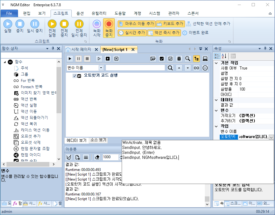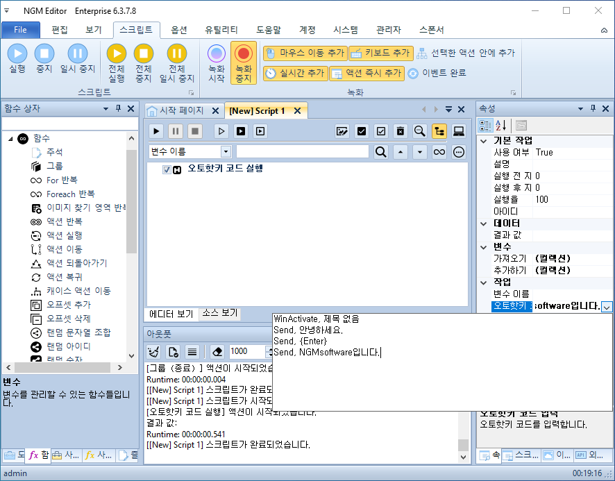 [ 오토핫키 코드 실행 ] 액션을 추가하고, 아래와 같이 코드를 작성하세요.