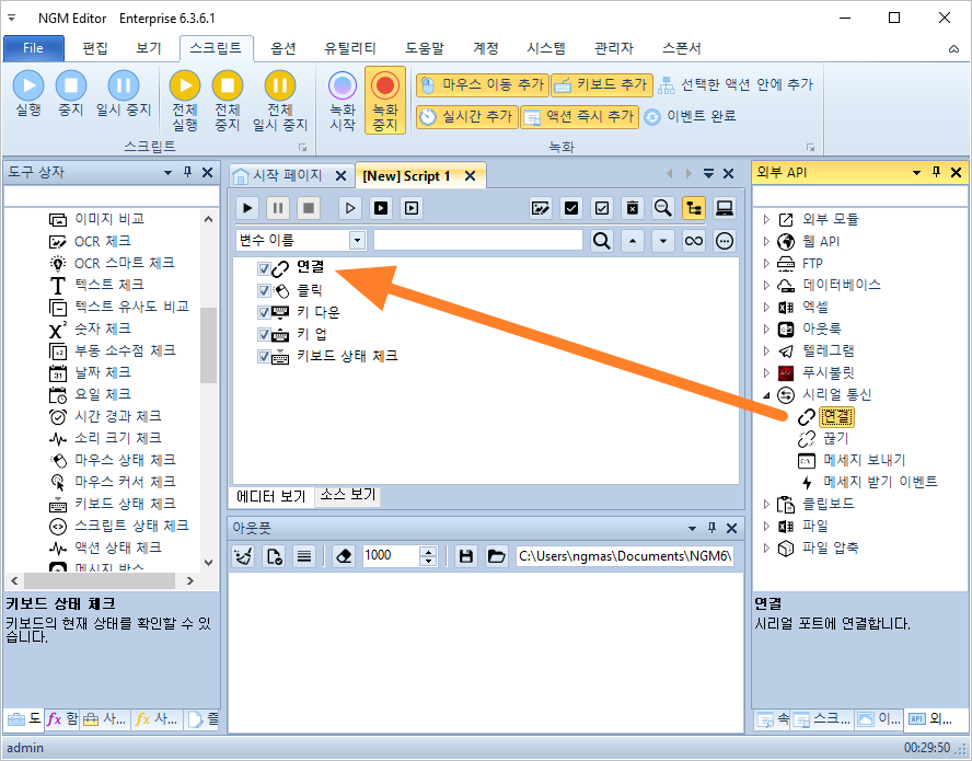 자~ 이번에는 실제 마우스, 키보드와 같이 동작하는 기계식(하드웨어) 매크로를 테스트 해보도록 하겠습니다. 아래 그림과 같이 시리얼 통신의 [ 연결 ] 액션을 가장 위에 추가하세요.