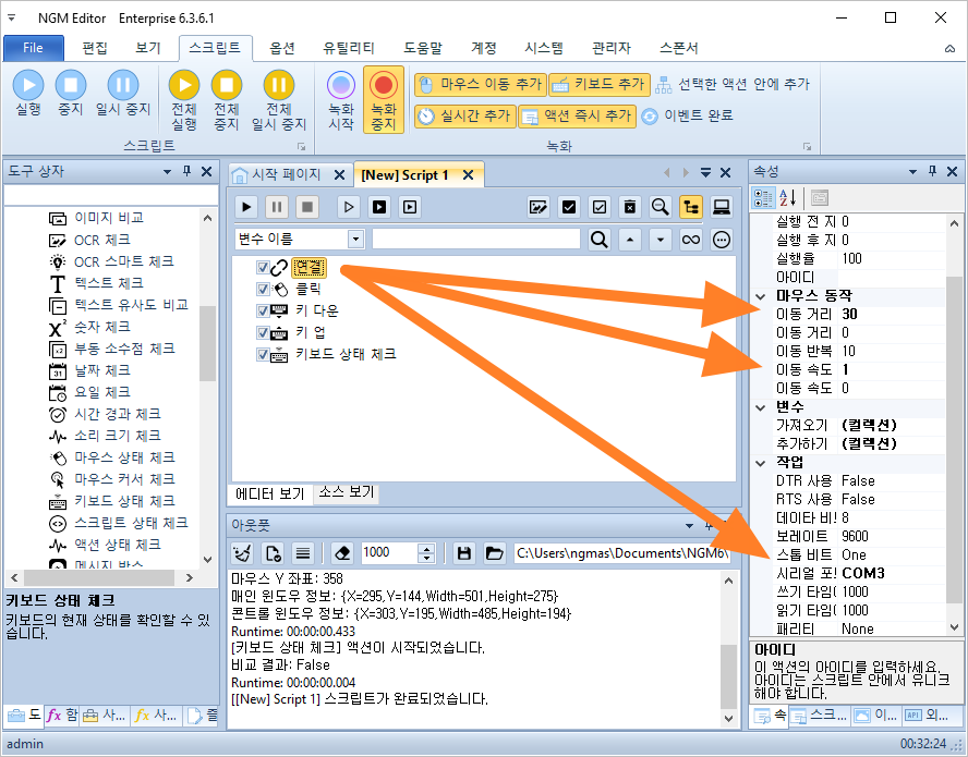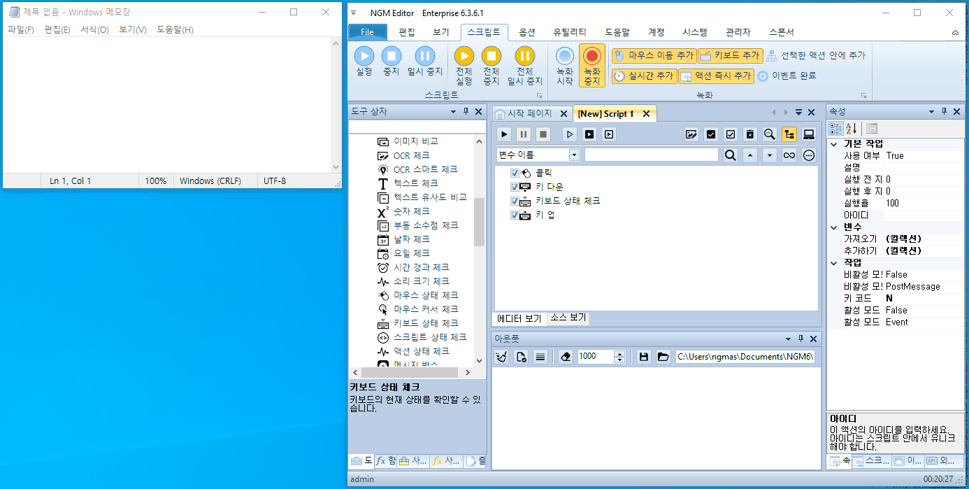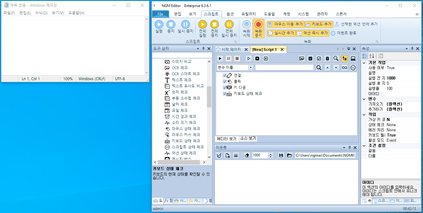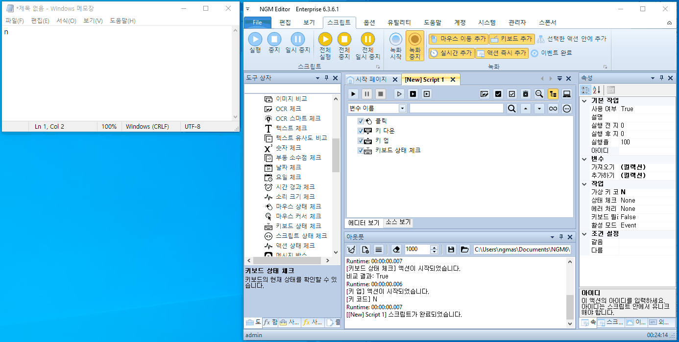 스크립트는 아래 그림과 같이 단순합니다. 첫번째 클릭 액션은 키보드 입력이 발생할 메모장을 클릭합니다. 활성 모드에서는 키보드 입력을 받을 프로그램(메모장등등...)이 활성 상태여야 하기 때문입니다. 두번째 키 다운은 N키를 누르도록 설정 해두었습니다. 그리고, [ 키보드 상태 체크 ]는 현재 눌려진 키와 설정한 키가 같으면 True를 반환합니다. 마지막으로 키 업 액션으로 현재 눌려진 키를 업시켜주세요.