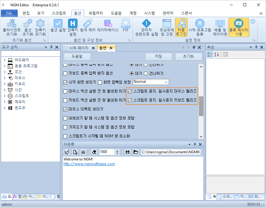 참고로, 에디터 및 플레이어 옵션에서 스크립트가 중지되거나 일시중지시에도 마우스와 키보드를 자동으로 릴리즈 할 수 있는 옵션이 추가 되었습니다.