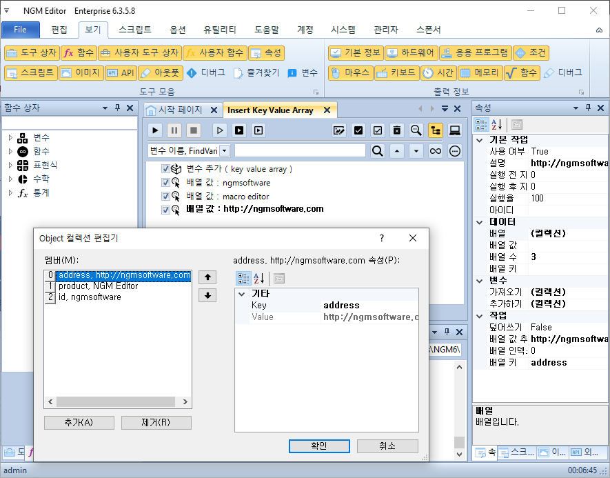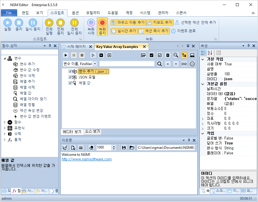 안녕하세요. 엔지엠소프트웨어입니다. 이번에 [ JSON 모델 ]을 추가하면서, 배열을 좀 더 쉽게 처리할 수 있도록 [ 배열 값 ] 액션도 같이 개선되었습니다. 배열 값은 변수에 저장된 배열(string, int...) 또는 KeyValuePair와 같은 배열에서 인덱스에 위치한 값을 가져오거나 추가하는 기능을 합니다. 이번 개선으로 단순 인덱스 처리가 아닌 Key로 배열을 탐색하고, 값을 가져오거나 추가할 수 있도록 개선되었습니다. 첨부되어 있는 스크립트를 에디터에서 열어주세요.