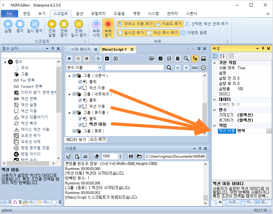 스크립트가 종료되지 않고, 계속해서 키보드에 반응하게 하려면 어떻게 해야 할까요? 그룹 안에 있는 모든 액션 이동을 "반복"으로 바꾸면 됩니다.