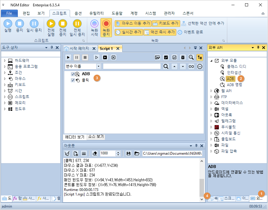 - 외부 모듈 카테고리를 확장하고, ADB 액션 선택