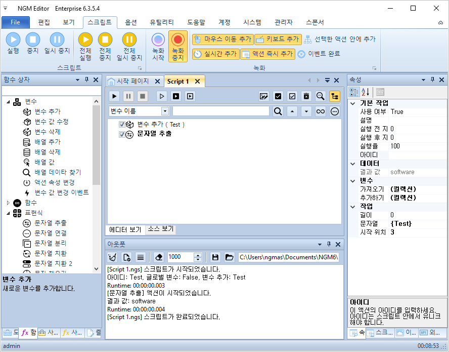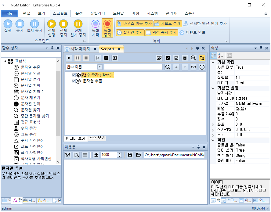 안녕하세요. 엔지엠소프트웨어입니다. 변수 사용의 편의성을 높이기 위해 문자(Text, 텍스트) 속성을 가진 액션에서 변수를 쉽게 가져올 수 있도록 기능을 개선하고 있습니다. [ 문자열 추출 ] 액션은 원본 문자열에서 원하는 문자열만 추출할 수 있습니다. 아래와 같은 문자가 있을 때 처리하는 방법입니다.