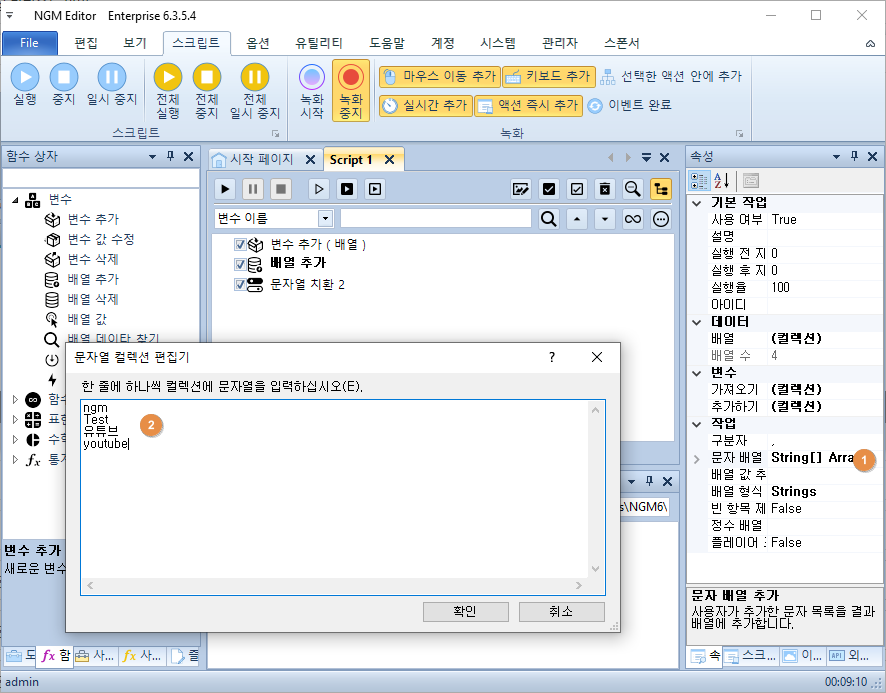 [ 배열 추가 ] 액션을 스크립트에 추가한 후 ①문자 배열 추가를 클릭하세요. 그리고, ②한 줄에 하나씩 아래와 같이 내용을 추가 해줍니다.