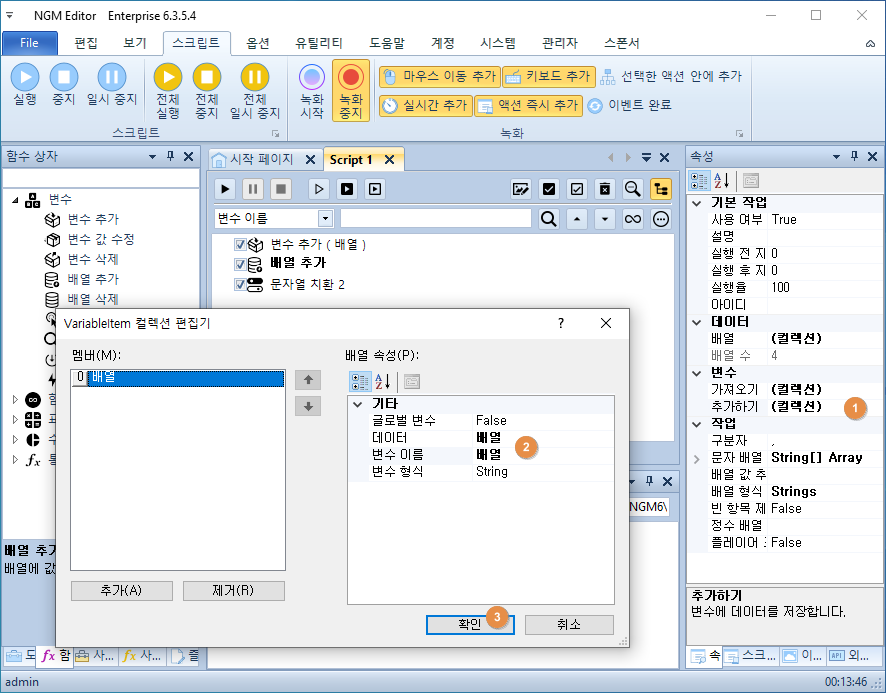 아래 그림을 참고해서 배열을 변수에 추가 해줍니다. 변수 카테고리의 ①추가하기를 클릭하고, ②변수를 선택 해줍니다. ③확인을 클릭하세요.