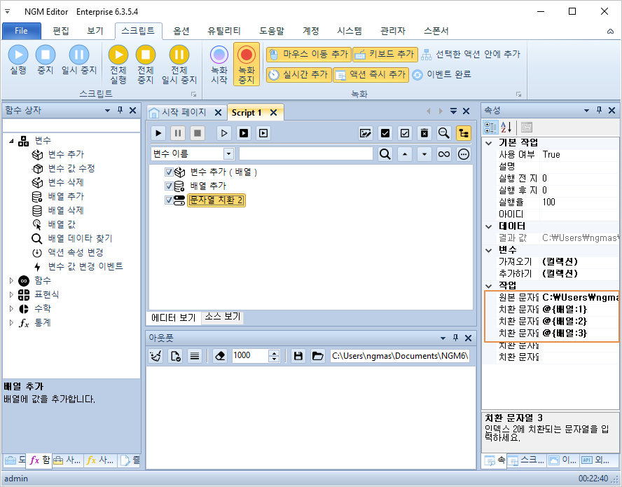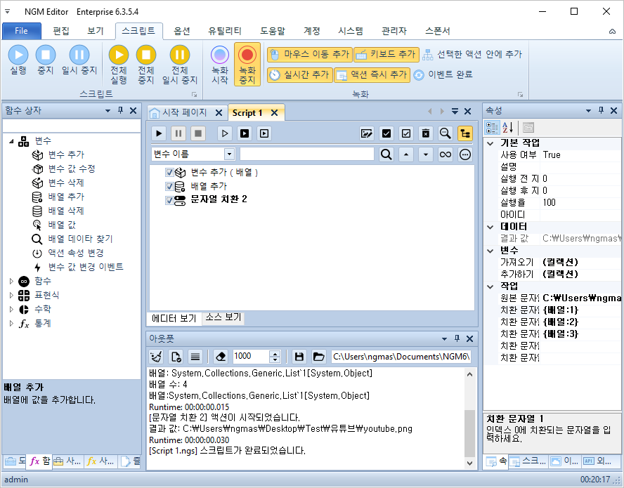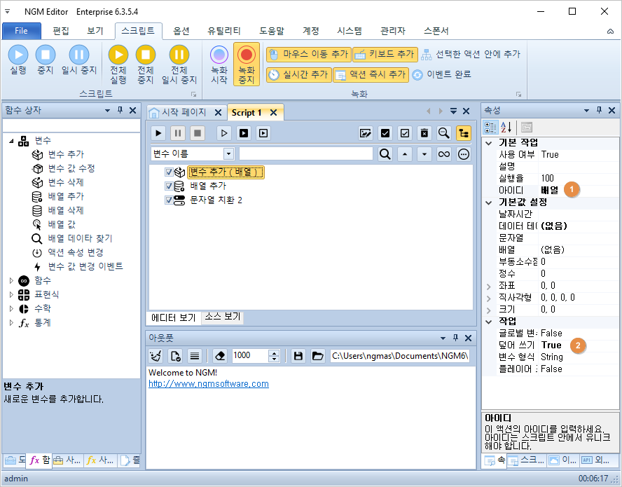 좀 더 쉽고 빠르게 변수의 값을 적용하기 위해 속성에서 직접 변수의 값을 가져올 수 있도록 기능이 개선되었습니다. 이 기능을 테스트하기 위해 새로운 스크립트를 하나 추가하세요.